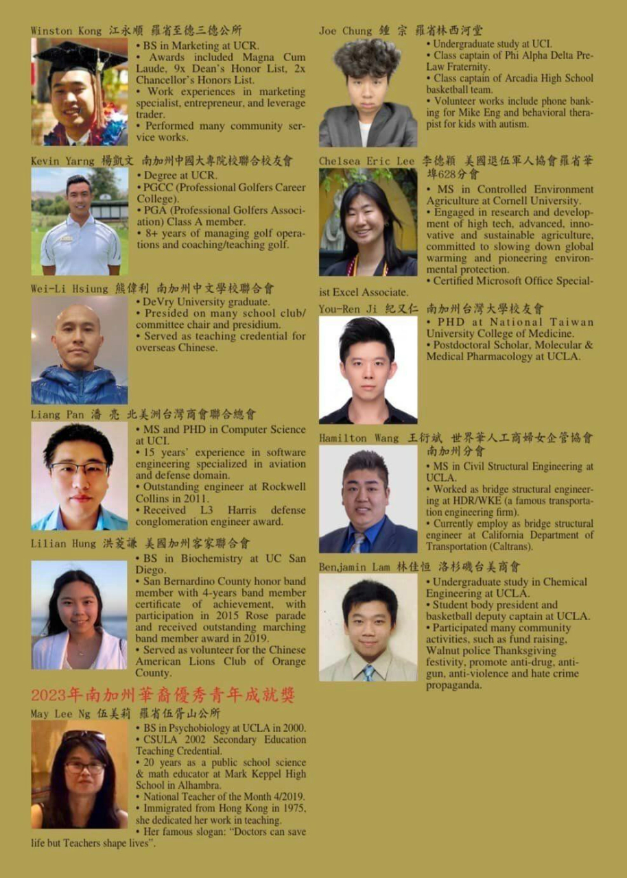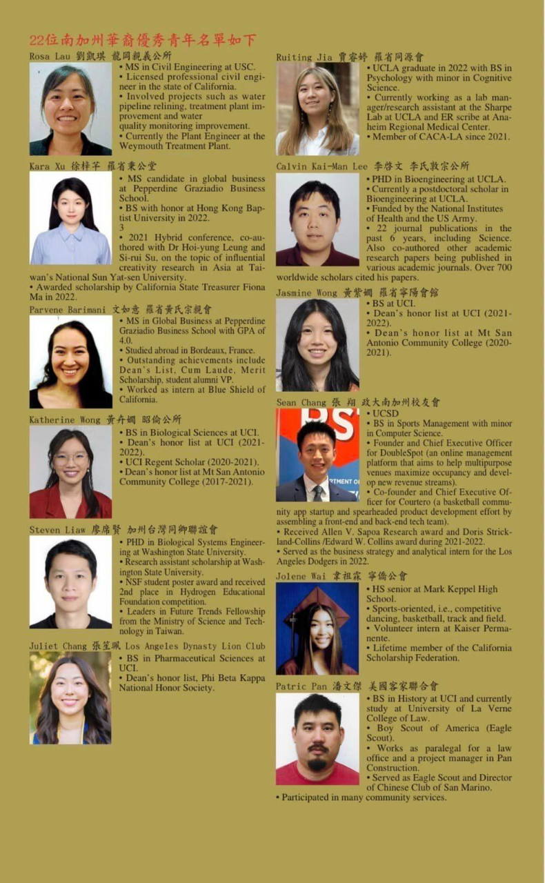 今年共有22位青年獲頒「南加州華裔優秀青年獎」,另外1位獲得「南加州華裔優秀青年成就獎」。