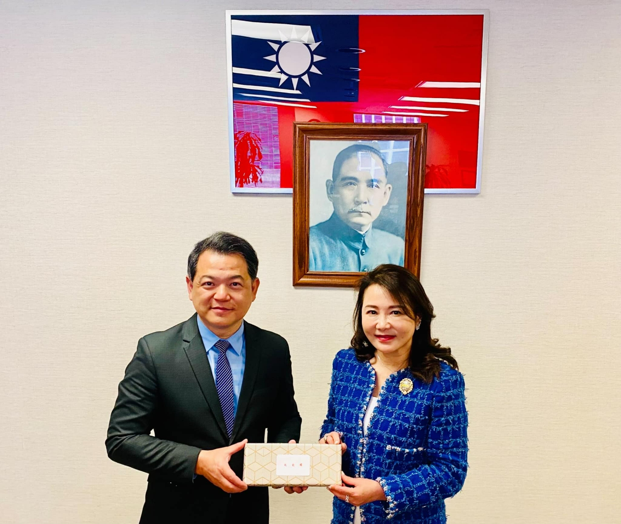 紀處長致贈來訪的世華姊妹們本處紀念馬克杯。(左起:黎淑瑛名譽總會長、紀處長、莊住維總會長、陳玲華副總會長)