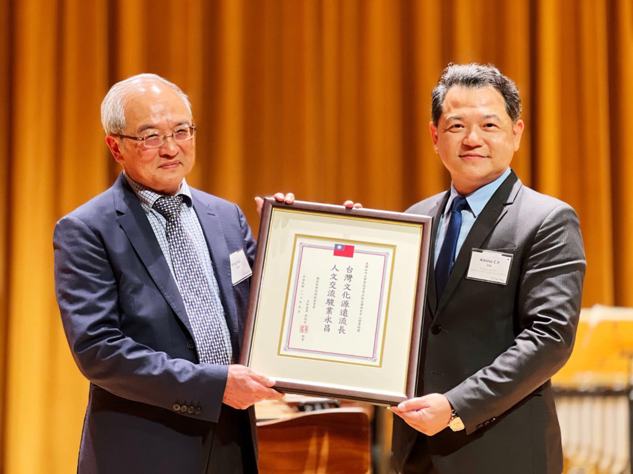 紀處長特別代表行政院政務委員兼 國家科學及技術委員會主任委員吳政忠博士頒予賀狀,肯定設立「台灣研究中心」對推動台灣研究的貢獻,由廖炳惠主任代表接受。