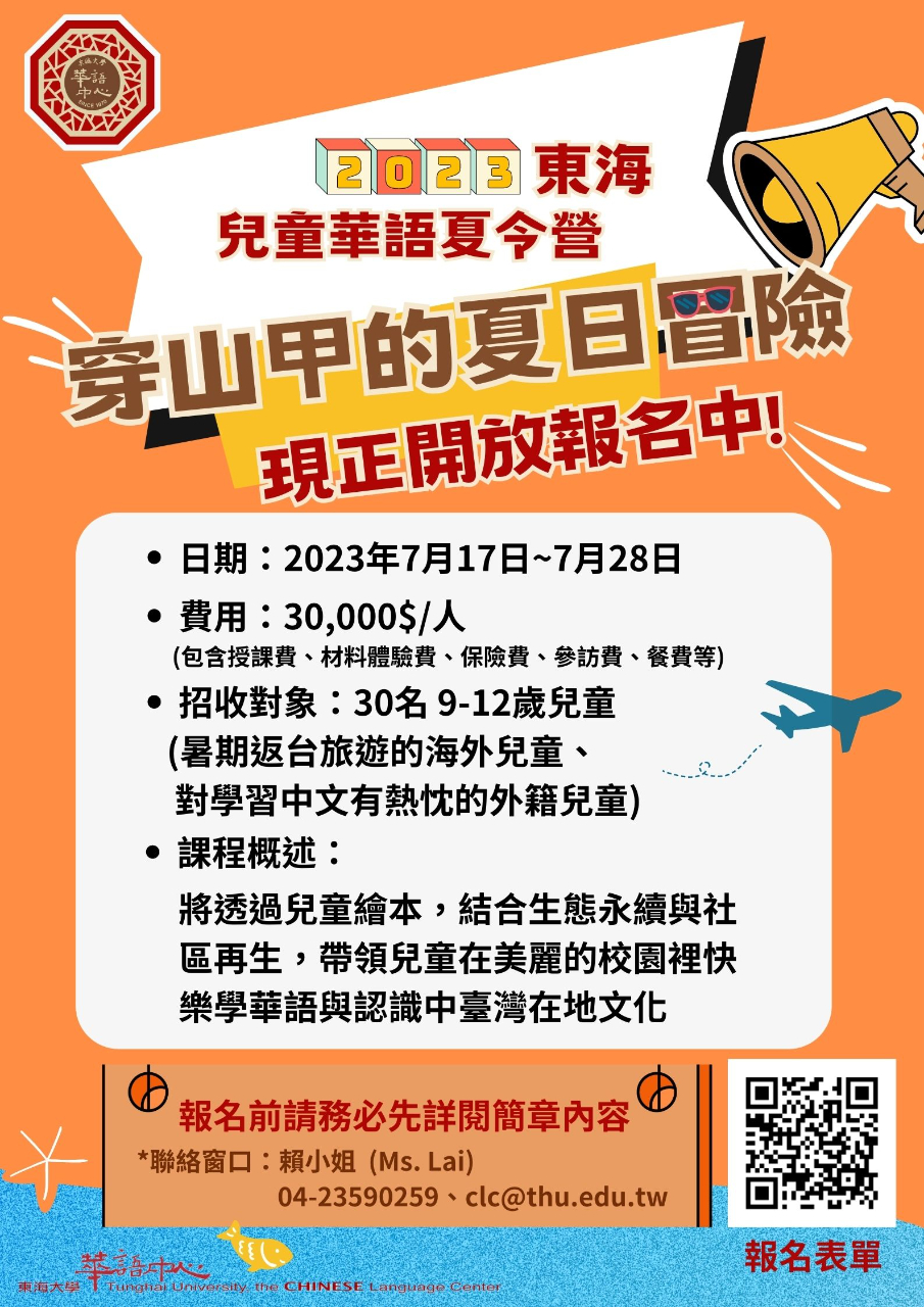 在2023年的暑假期間,東海大學華語中心將舉辦一個獨特的暑期營隊,以兒童繪本為基礎,結合穿山甲的故事、生態永續和社區再生的主題,讓孩子們在美麗的校園中快樂學習華語,同時認識中臺灣的在地文化。 東海大學華語中心,創立超過50年,重視語言教學與生活體驗的互動,期望學員能將所學活用於生活實踐。除了根據孩子們的能力進行華語分班的語言課程外,這個營隊還提供了許多機會,讓孩子們在中臺灣的人文社會和大自然中遊走,學習如何與社區和動植物共同生活。在自然觀察課程中,學生有機會漫步於東海大學校園和東大溪沿岸,並進行攀樹、學習蜜蜂知識,以及製作蜂蜜餅乾和香草鹽麵包。另外,營隊還將組織參訪活動,實地到穿山甲的家「臺中市南屯區」,讓孩子們體驗和認識當地的文化。 營隊期間: 2023年7月17日至28日。 招生對象: 30名 9-12歲海外兒童,額滿為止。 線上報名: https://forms.gle/bspTGPR96P8MBWoG6。