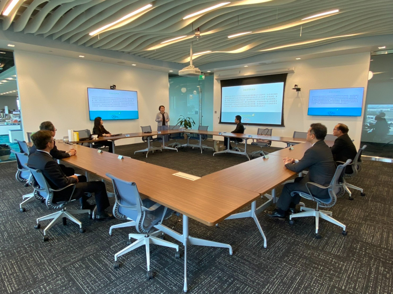 長榮航空美洲總分公司辦公大樓位於洛杉磯國際機場附近的El Segundo。葉協理為紀處長一行就該大樓購地自建、建築施工、營運轉銷及室內設計巧思等進行精彩簡報,隨後由蘇副總經理陪同參觀迎賓大廳、辦公室及員工休憩餐廳、健身房等公共空間之設計規劃。