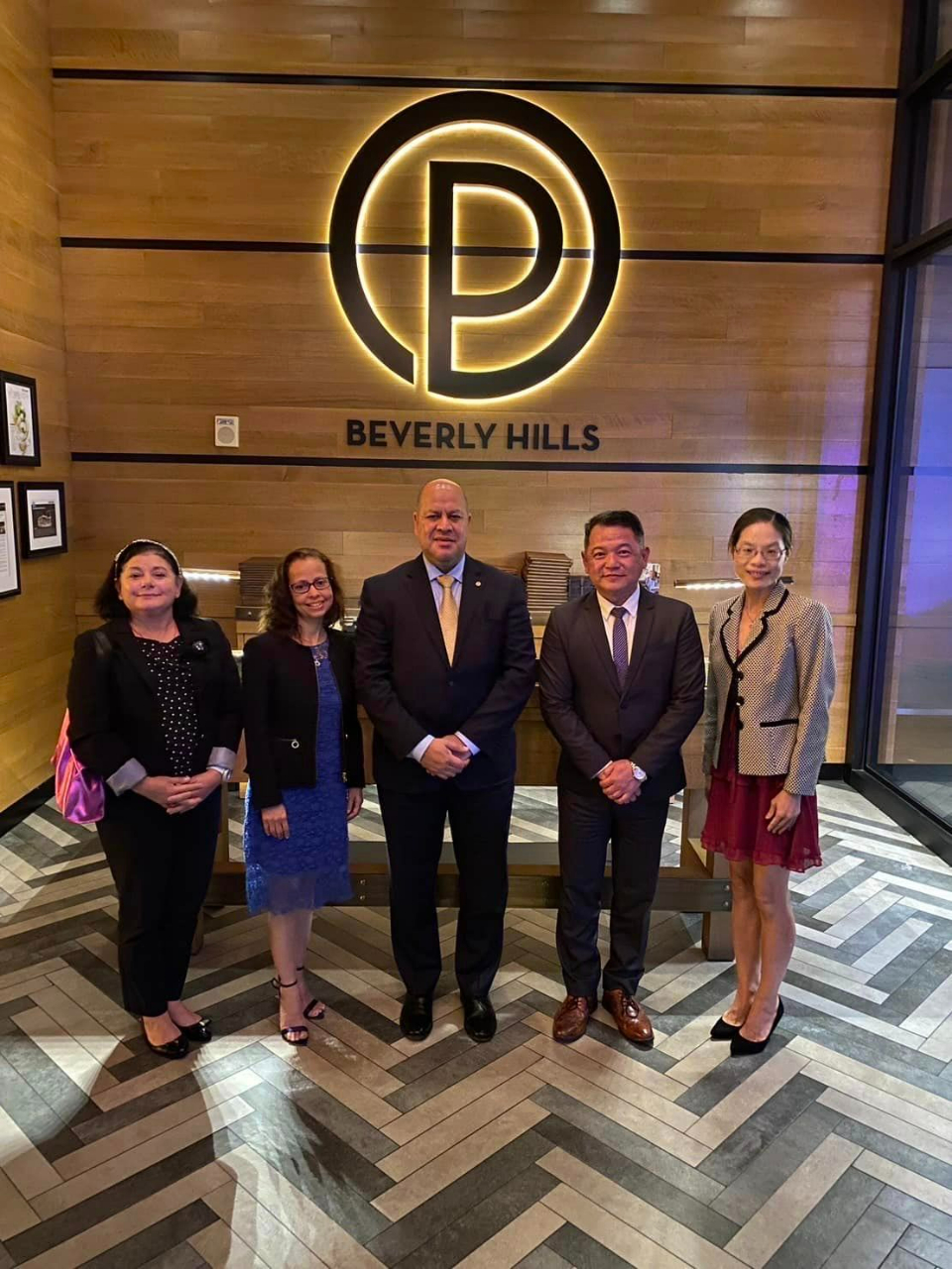 與宴人員合照-紀欽耀處長(右2)、巴拉圭駐洛杉磯總領事Manuel Ruiz Diaz(中)、鄭如惠組長(右1)、巴館資深領務秘書Annalisa Verdun(左1)及Marta Cristaldo(左2)