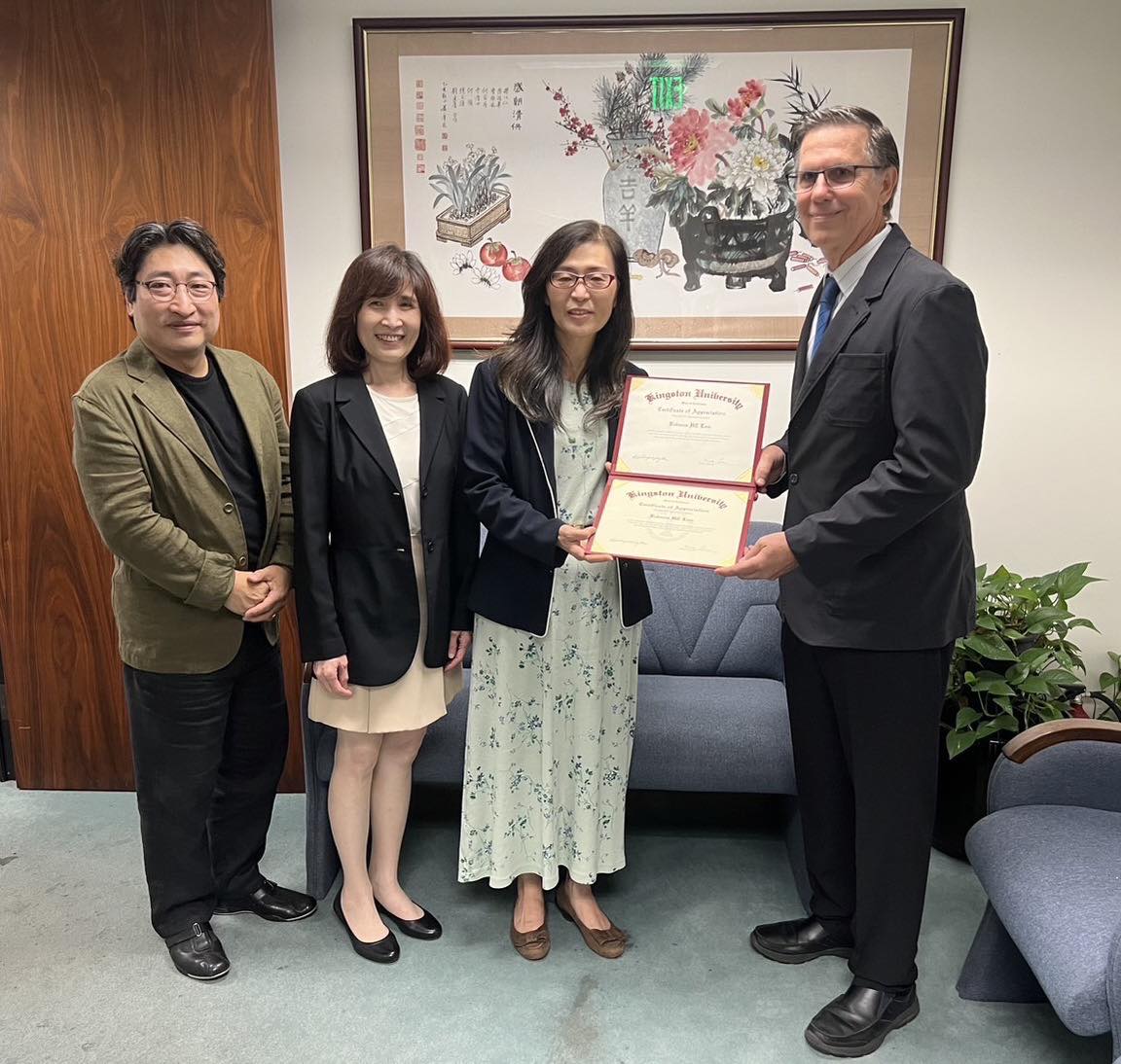 紀欽耀處長很高興於7月26日在本處會晤來訪的Kingston University Pasadena CA校長Dwight Layton 、營運長Rosalia Hsieh 及Seong Soo Han教授等一行。