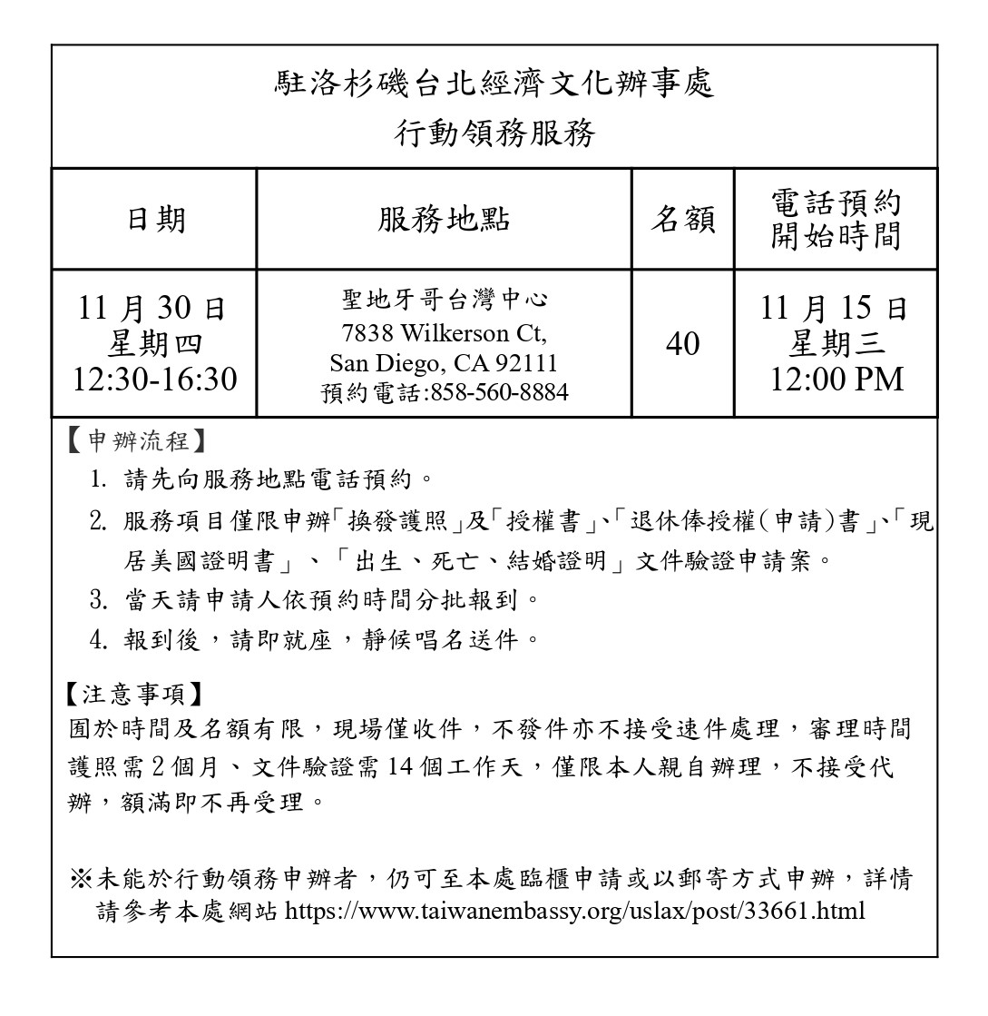 為服務聖地牙哥地區僑民,本處訂於本(2023)年11月30日星期四12:30至16:30於「聖地牙哥台灣中心」辦理行動領務,受理民眾申辦「換發護照」及「授權書」、「退休俸授權(申請)書」、「現居美國證明書」、「出生、死亡、結婚證明」等文件驗證申請案,共40個名額,請擬申辦之僑民自11月15日星期三中午12:00起,向「聖地牙哥台灣中心」電話預約,預約電話:858-560-8884。