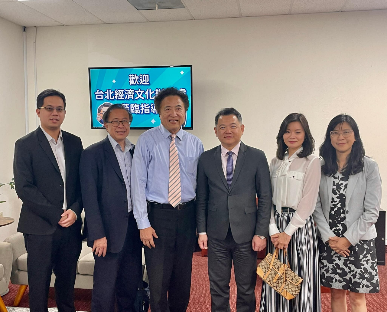 紀欽耀處長一行參訪華興保險集團 (左起:科技組陳嘉元組長、經濟組劉倫正組長、張國興總裁、紀欽耀處長夫婦、黃翠娟簡任秘書)