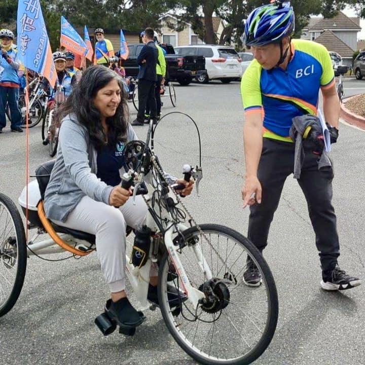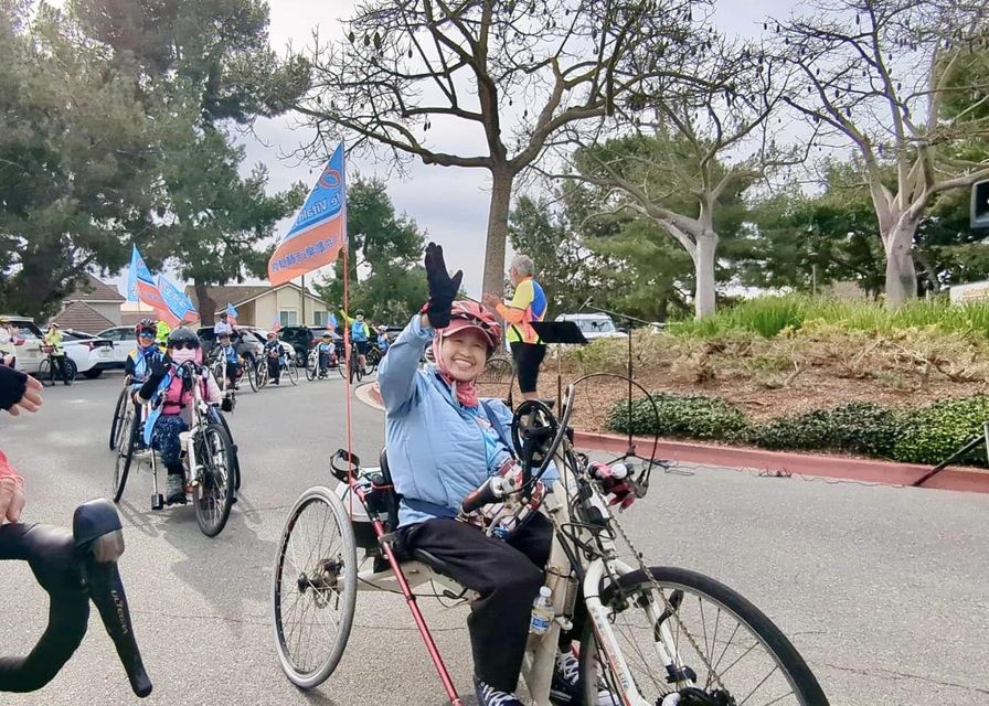 爾灣市自行車俱樂部騎士們熱烈歡迎台灣生命勵樂活輔健會身心障礙手搖自行車勇士們進場