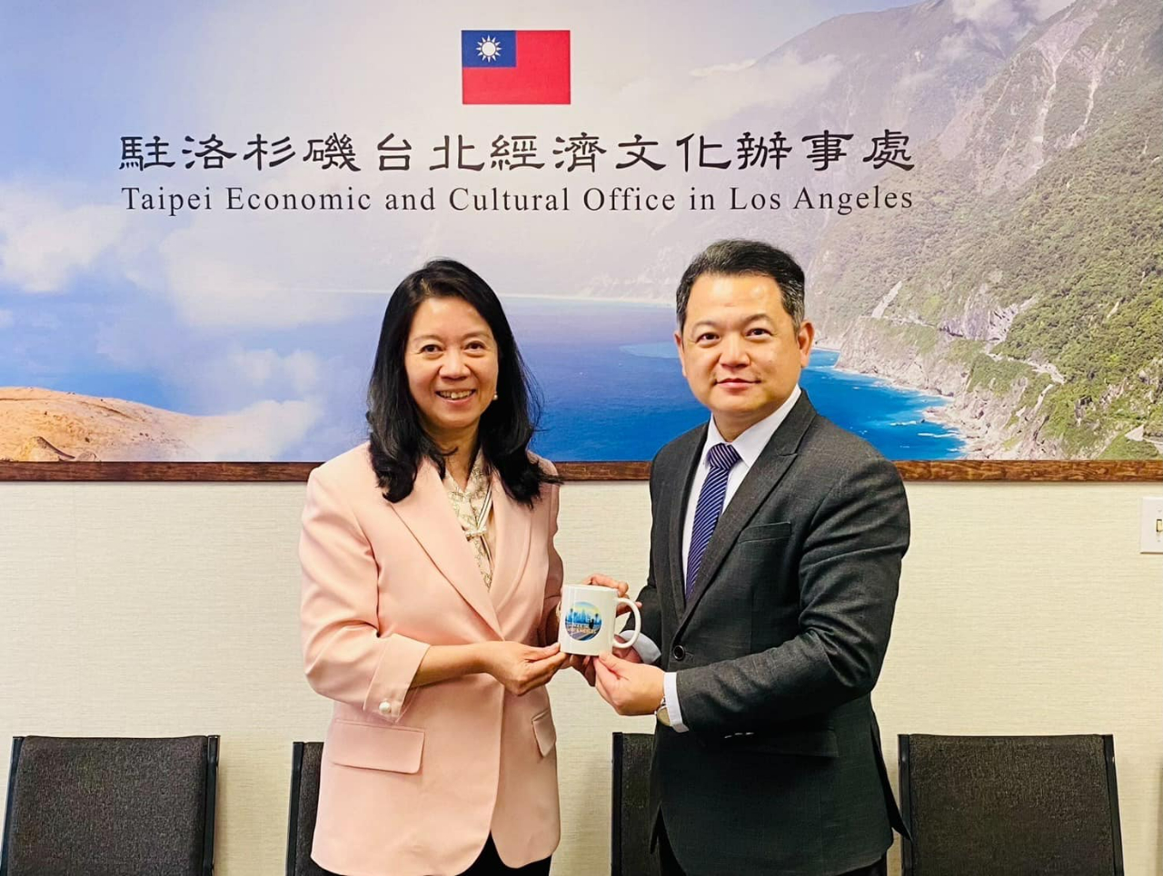 紀處長致贈僑聯總會童理事長等來訪貴賓本處紀念馬克杯