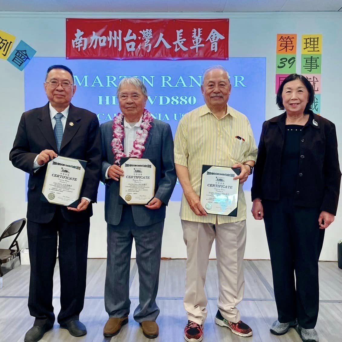 紀欽耀處長7月18日出席第39屆南加州台灣人長輩會理事團隊宣誓就職典禮,並見證會長交接。滿任會長陳嘉功成身退,新任會長江美絹承諾將繼續將長輩會打造成溫暖的大家庭。