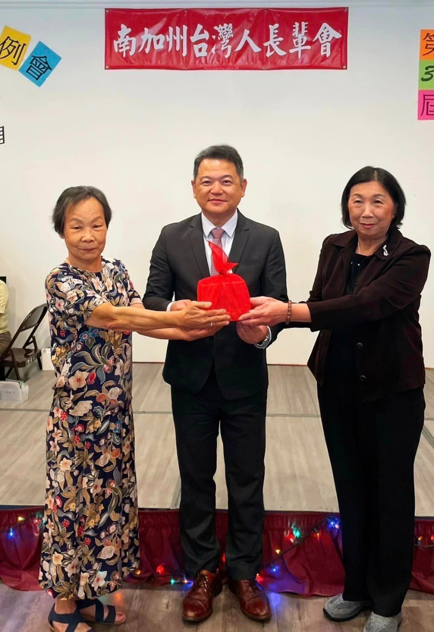 紀欽耀處長見證南加州台灣人長輩會會長交接:滿任會長陳嘉由王喜美副會長代理(左1)交接予新任會長江美絹(右1