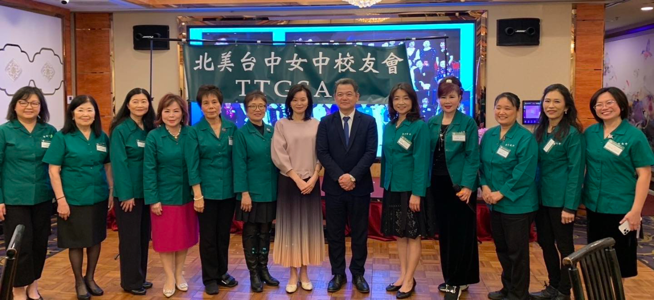 圖說1:紀欽耀處長夫婦、北美台中女中校友會滿任會長蕭迪玉(左6)、新任會長陳昭如(右5)與校友們合影。