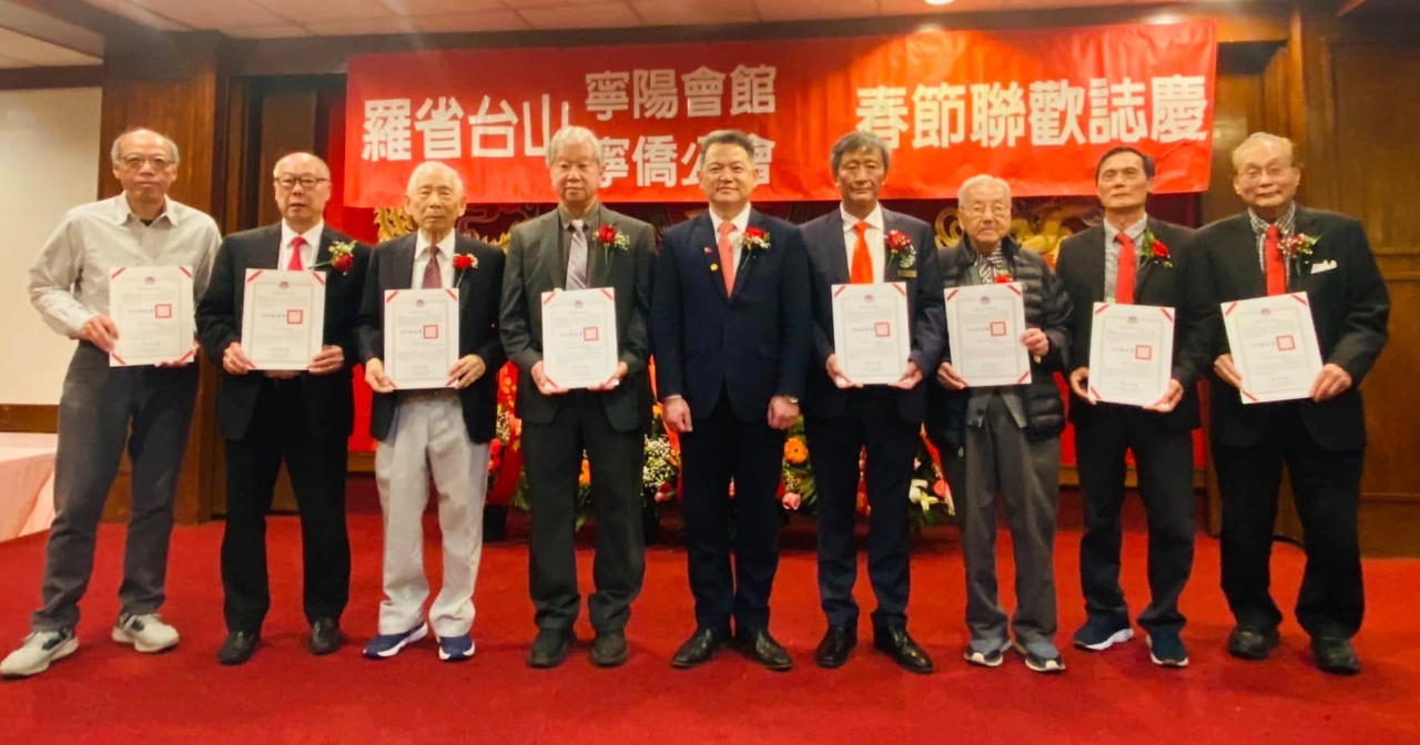 紀處長代表僑委會徐佳青委員長頒贈賀狀予台山寧陽會館連任主席伍堅偉(右4)、副主席伍子行(右1)、寧僑公會連任會長譚新誠(左4)及副會長朱栢田(左2);另藉春宴活動,頒贈賀狀予黃氏宗親會連任主席黃祖勝(右2)、副主席黃鉅華(左1)、羅省朱沛國堂連任主席朱匡文(左3)及副主席朱兆杰(右3)。