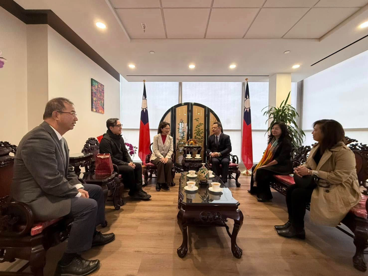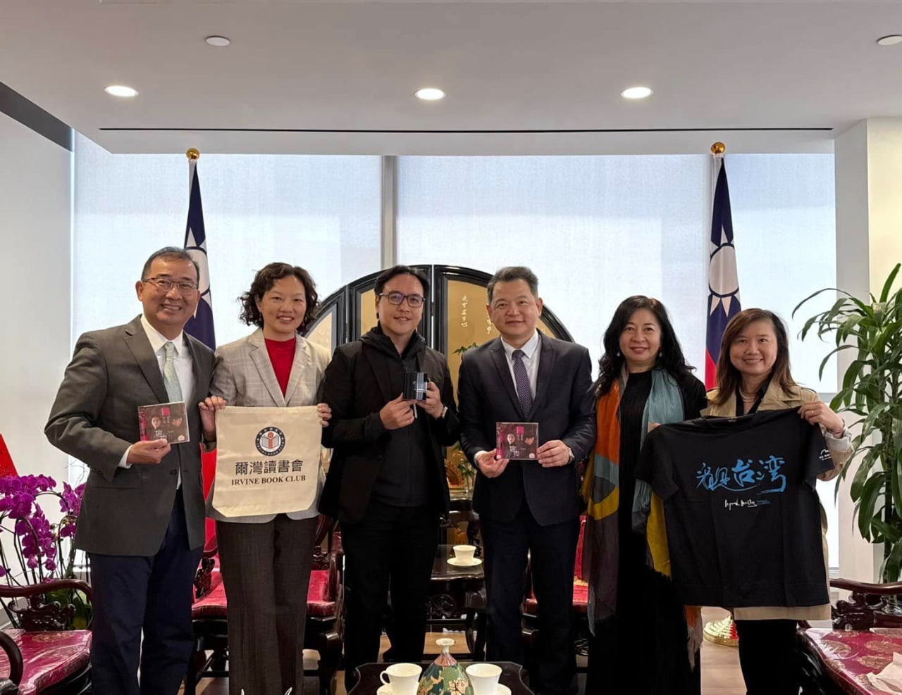 紀欽耀處長於4月3日在本處接待台灣長笛音樂家林仁斌老師、爾灣讀書會李克琪會長夫婦、蔚藍人文堂創辦人楊蔚藍及加州執行長李慶芬,雙方就音樂藝文推廣等議題交換意見。