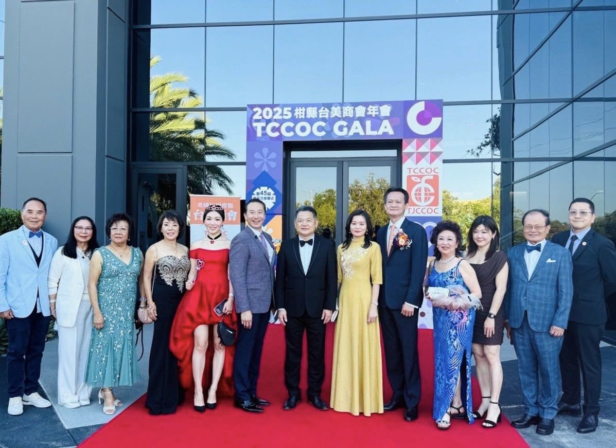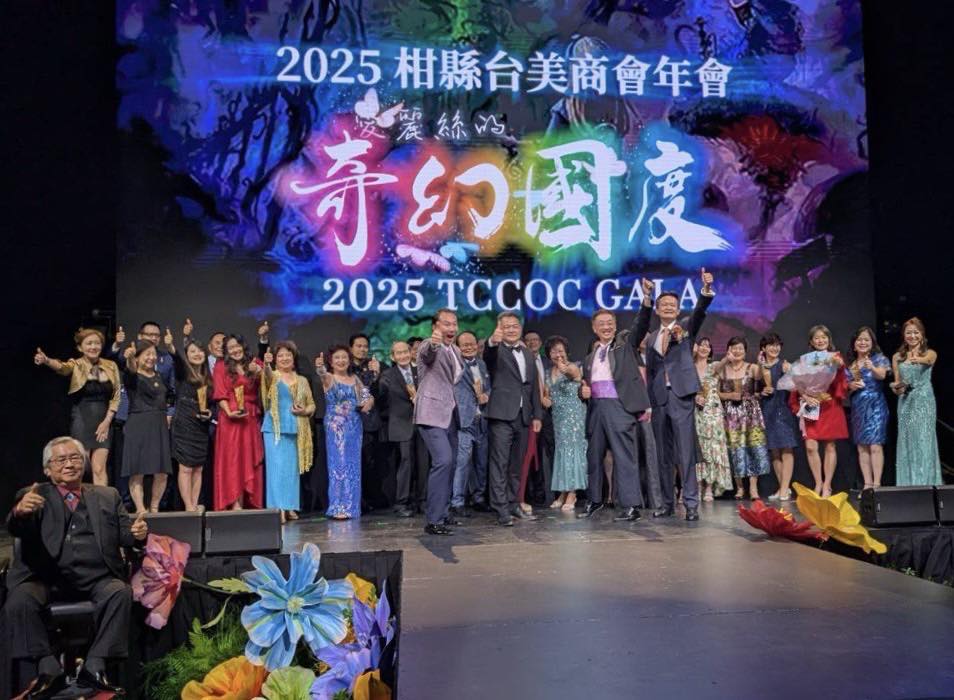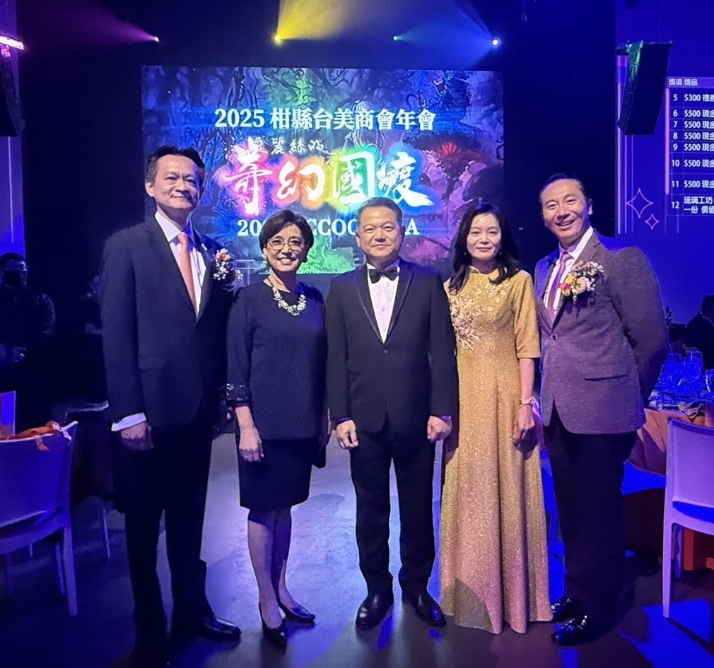 圖說1:紀欽耀處長夫婦出席2025柑縣台美商會年會暨會長交接典禮,與新舊任會長及幹部們合影。