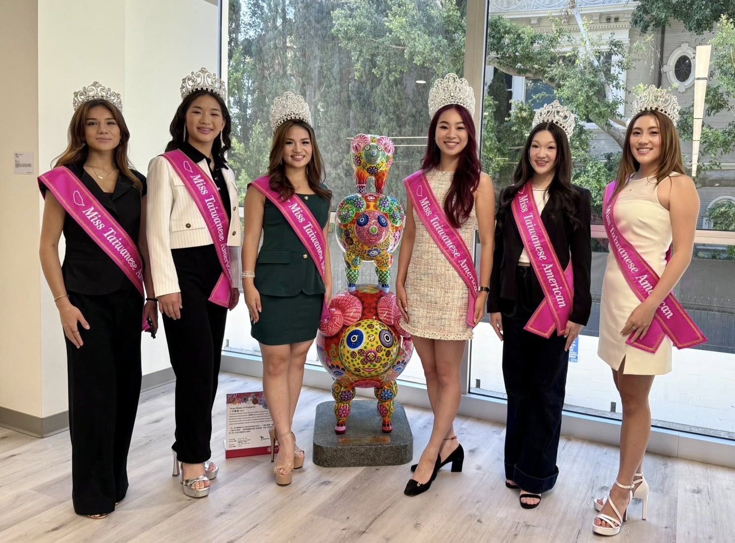 圖說5:2025台美小姐在領務大廳與洪易老師之作品《三羊開泰》合影。