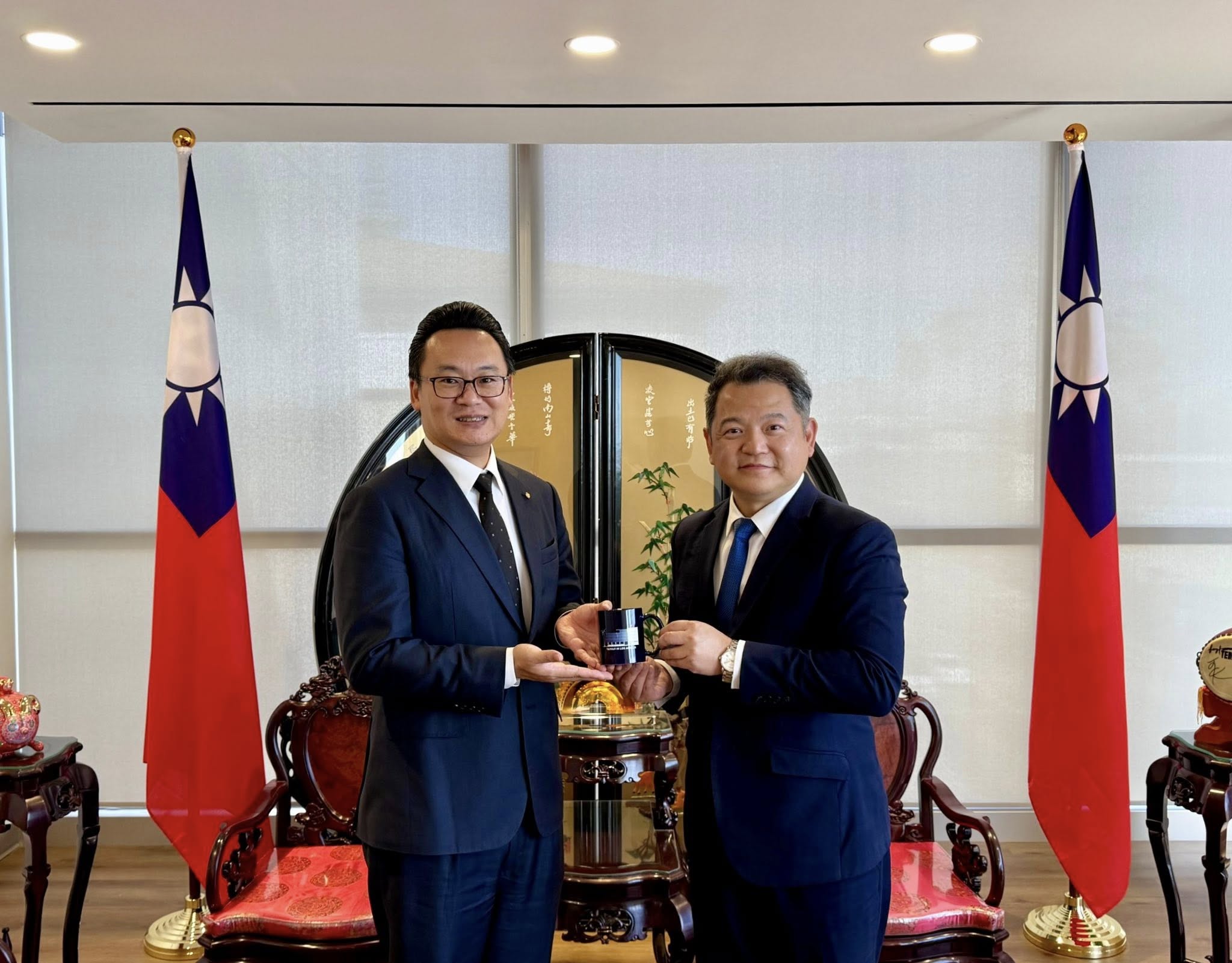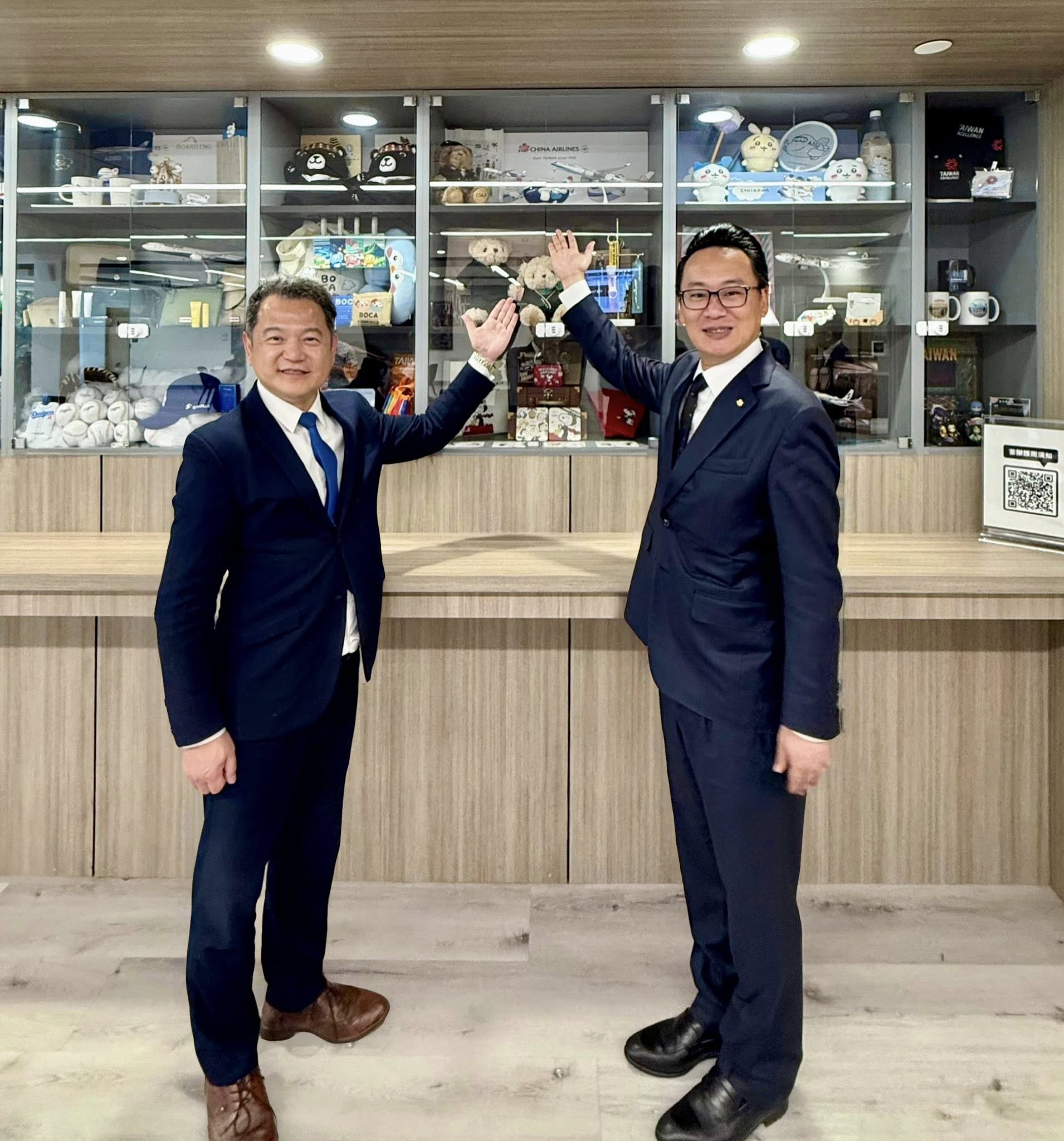 圖說1:紀欽耀處長(左)與華航陳漢銘總經理(右)於本處領務大廳形象櫥窗前合影。