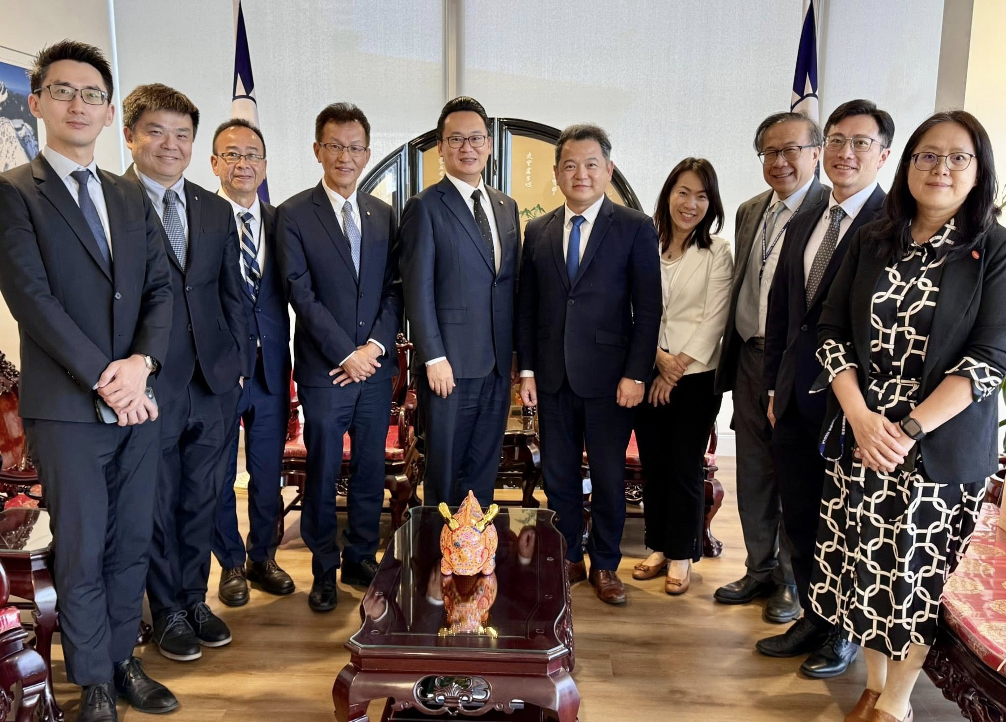 紀欽耀處長於8月22日在本處接待中華航空陳漢銘總經理及華航美洲地區鄭玉麟處長等一行5人。雙方就華航在北美的業務展望深入交流,紀處長並於會後陪同陳總經理參觀本處領務大廳。