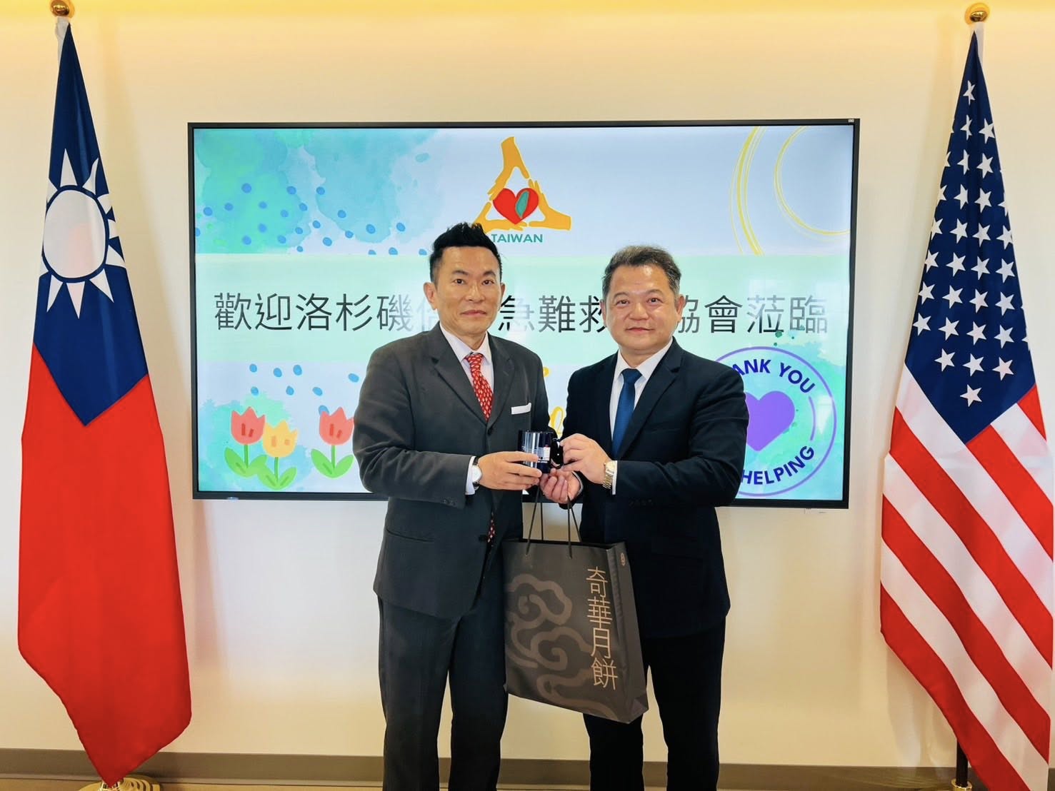 圖說2:紀欽耀處長與洛杉磯僑界急難救助協會楊家淦會長互贈紀念品。