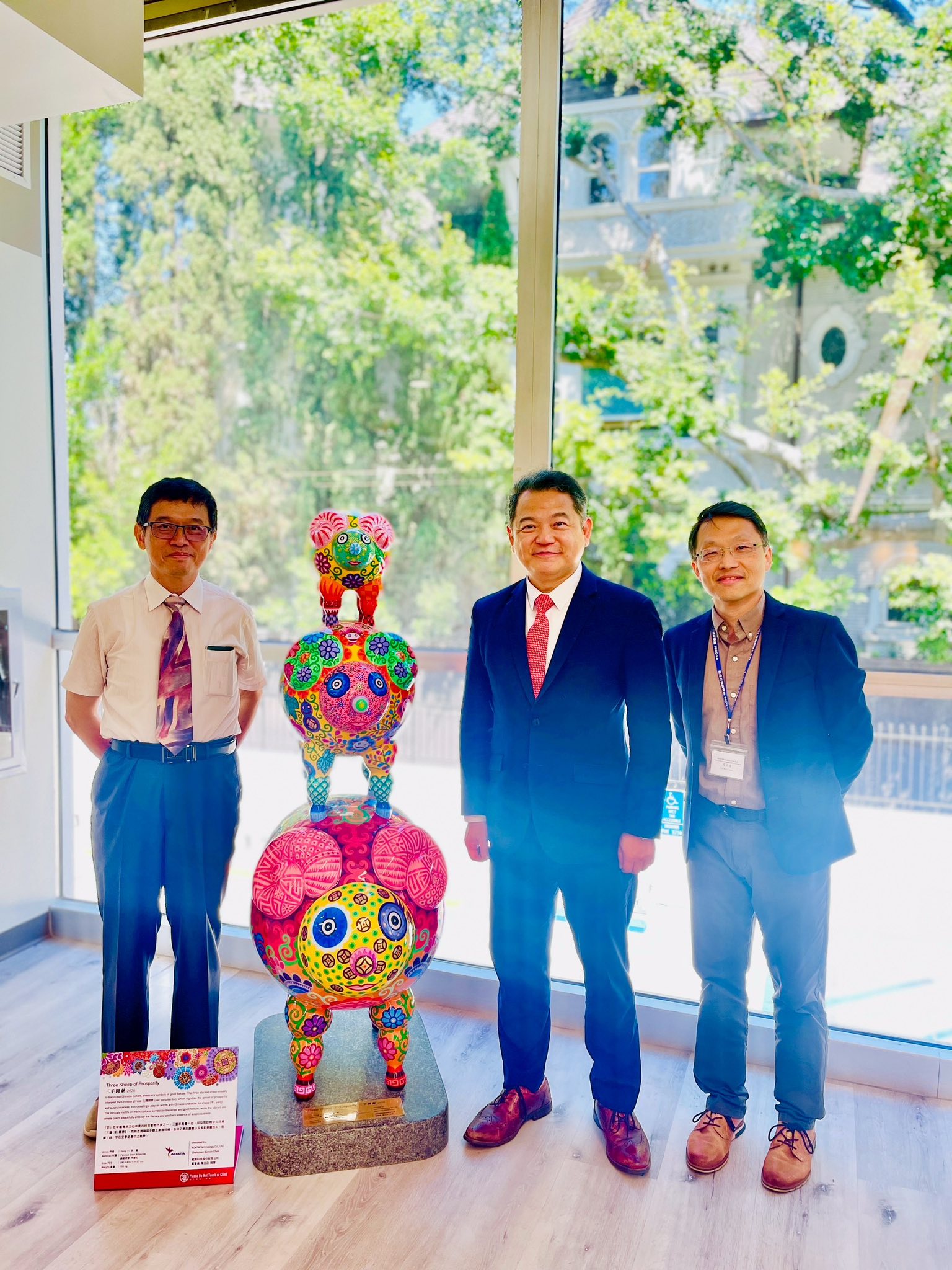圖說4:紀處長(中)、科技組周立偉組長(右)、謝教授(左)於本處領務大廳三羊開泰作品旁合影。