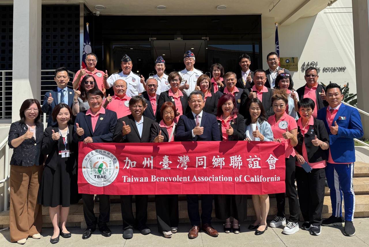 圖說1:紀欽耀處長(前排左6)偕同仁與加州臺灣同鄉聯誼會儲錦琪會長(前排左5)及該會幹部一行於本處1樓大門口合影。