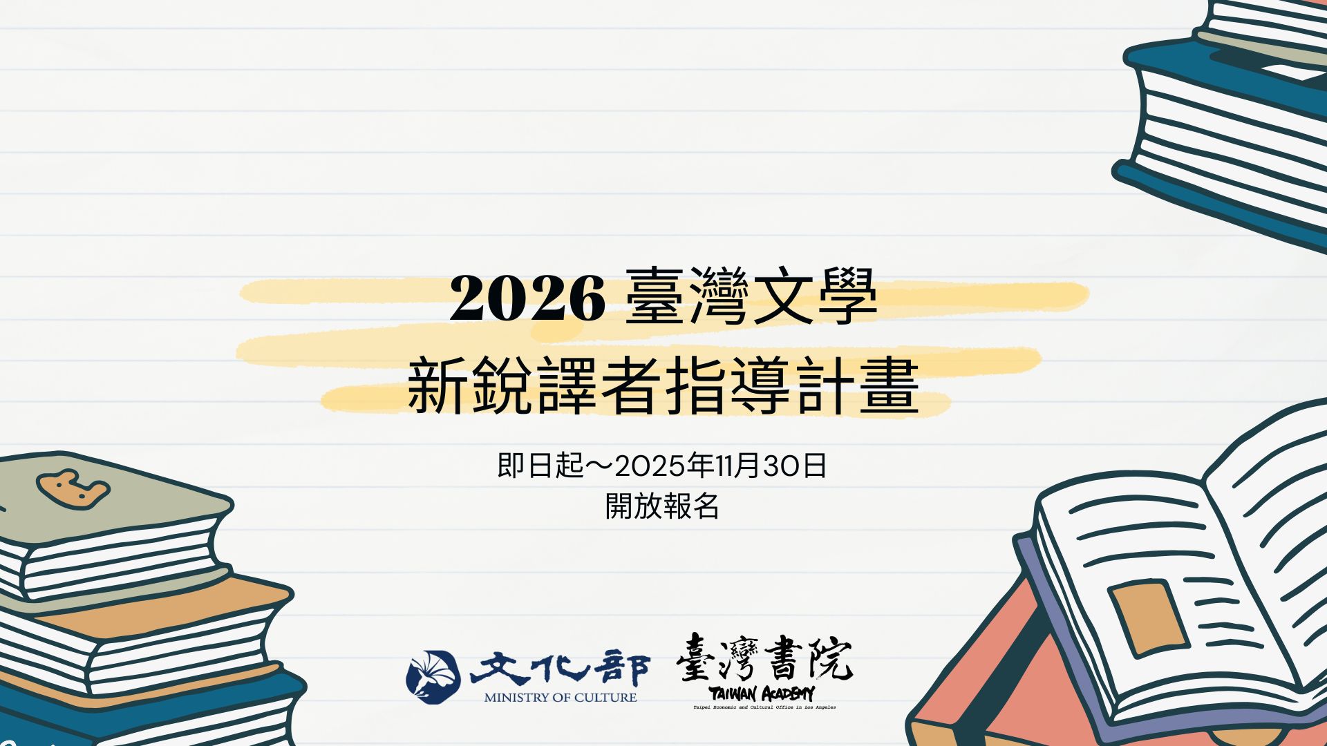 為培養臺灣文學外譯人才,推動臺灣文學英譯出版,文化部駐洛杉磯臺灣書院與美國文學翻譯家協會(American Literary Translators Association,ALTA)持續合作辦理「新銳譯者指導計畫(ALTA Emerging Translator Mentorship Program)」,將徵選1位新銳臺灣文學英語譯者於2026年接受指導,即日起開放報名,美西時間2025年11月30日截止。