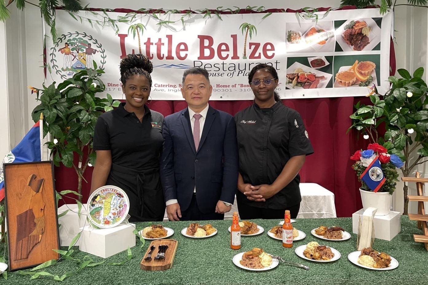 圖說3:紀欽耀處長與洛杉磯的貝里斯餐廳「Little Belize」主廚合影,品嚐貝里斯傳統美食「Rice & Beans 」加 「Marie Sharp 辣椒醬」。