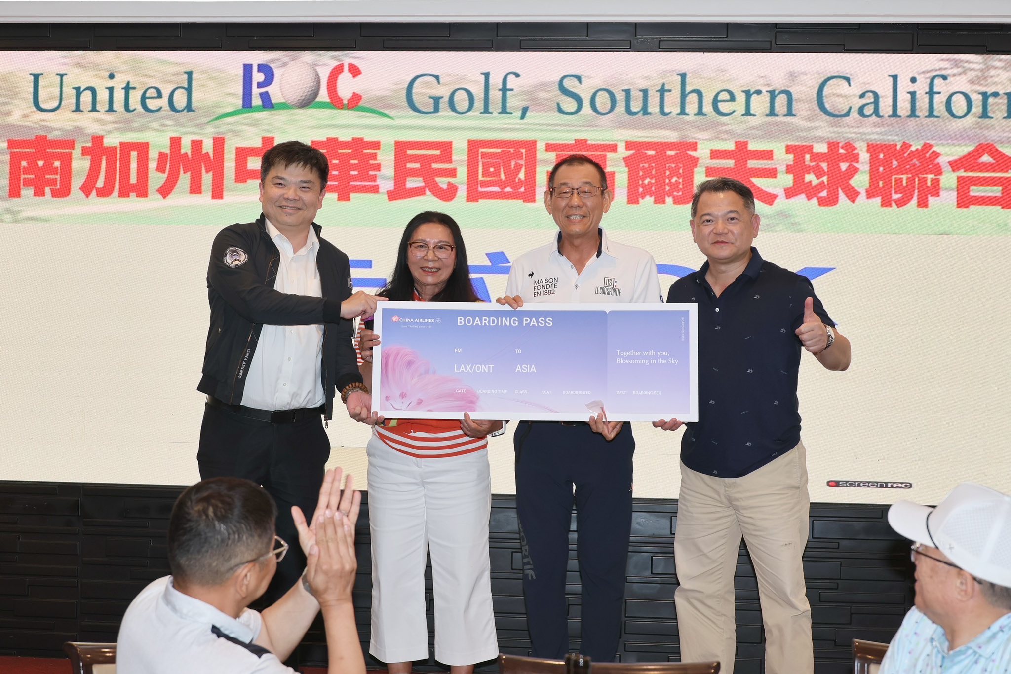 圖說6:紀欽耀處長、柯欣侑會長與華航張邱驊協理一同抽出頒獎晚宴特別獎「台北-洛杉磯來回機票」。