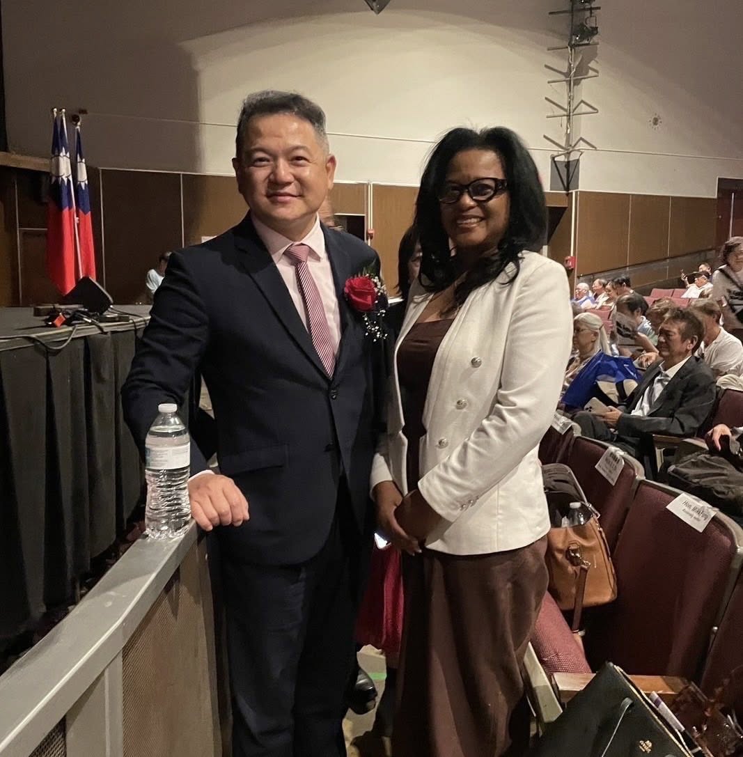 友邦貝里斯駐洛杉磯代理總領事Yvette Karen Gentle(右)出席觀賞雙十國慶文化訪問團演出,與紀欽耀處長合影。