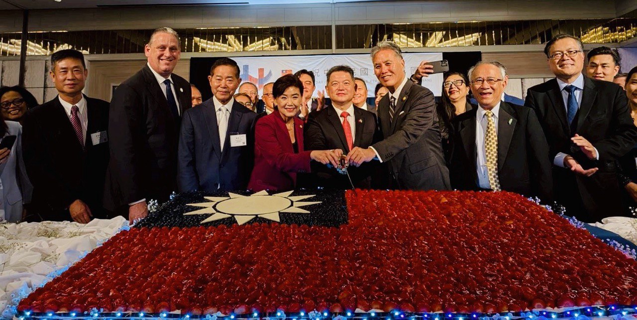 114年國慶酒會紀欽耀處長(右4)與美國聯邦眾議員趙美心(Congresswoman Judy Chu,右5)、聯邦眾議員高野(Congressman Mark Takano,右3)、加州州參議員石廷朗(Tony Strickland,右7)、加州州眾議員方樹強(Mike Fong,右1)、總統府國策顧問楊信(右6)、國策顧問及大洛杉磯台灣會館執行長林榮松(右2)、羅省中華會館主席聶澤英(右8)等出席貴賓合切國旗蛋糕。
