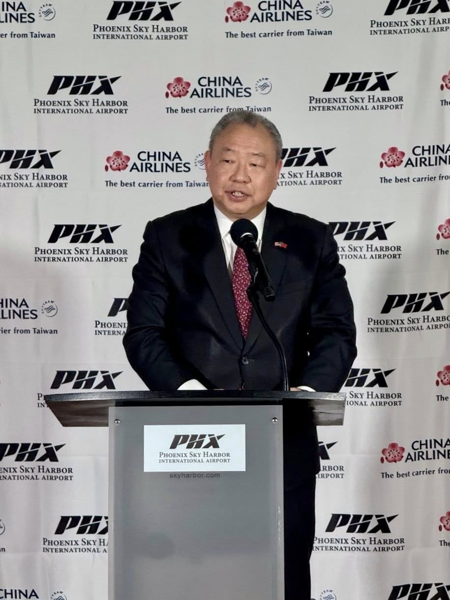 俞大使致詞時表示,台北-鳳凰城航線不僅是台灣與亞利桑納之間的第一條直飛航線,更是鳳凰城天港國際機場迎來的首條亞洲航線!期待新航線能促進兩地繁榮,特別是在AI等高科技領域,台美將深化合作,共同推動創新與發展。