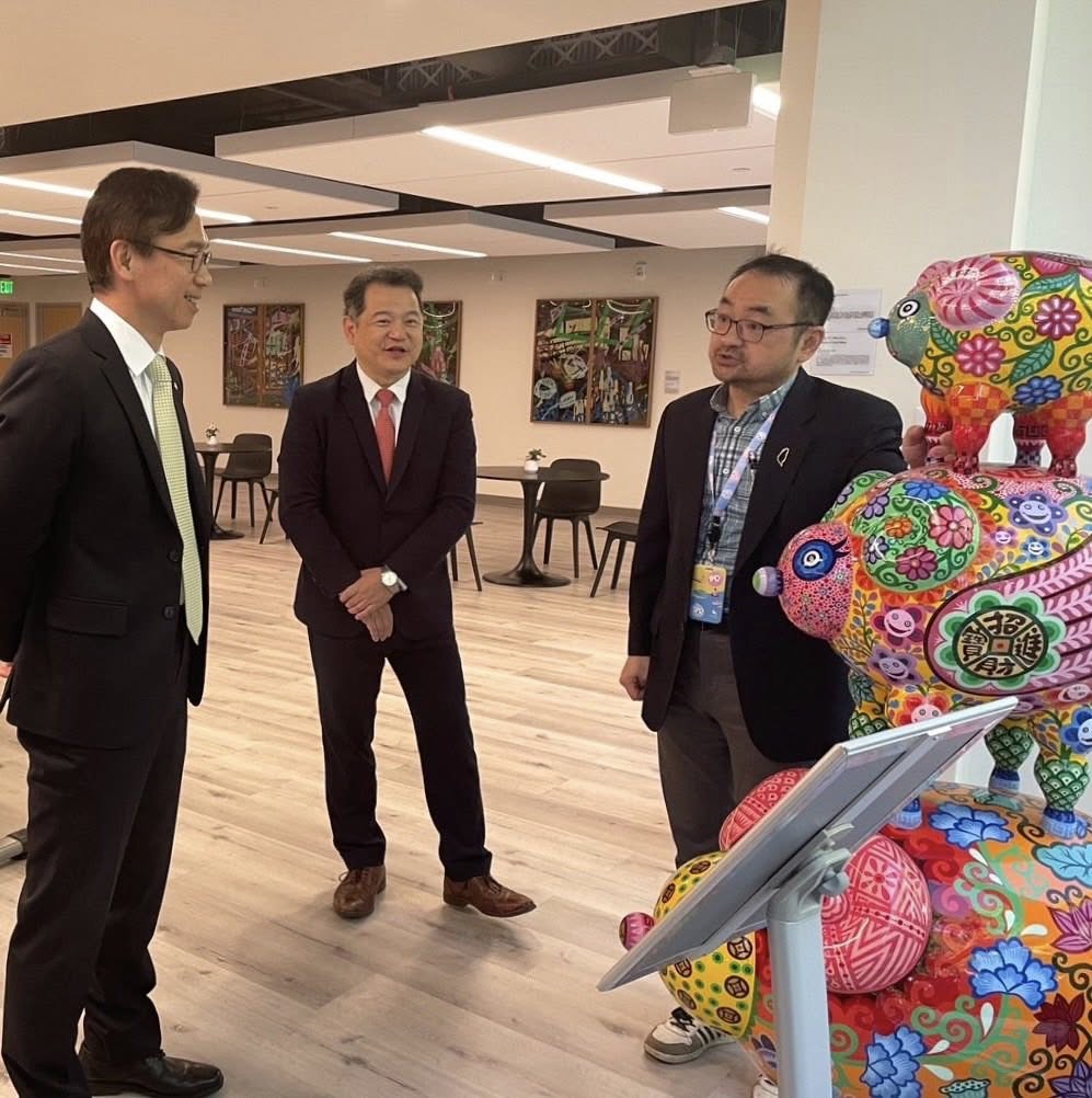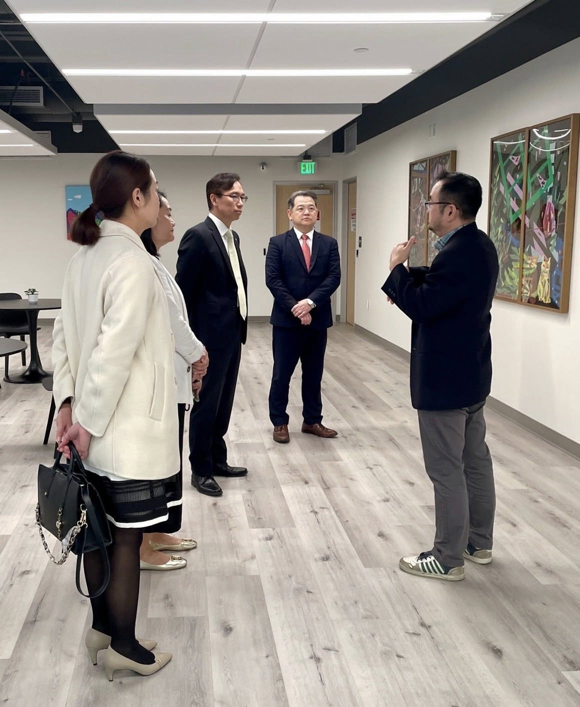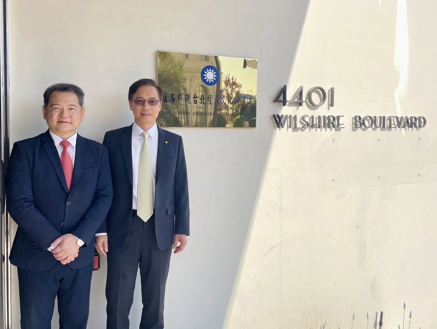 紀欽耀處長偕同仁接待長榮航空美洲總分公司蘇偉仁副總經理一行6人,並導覽參觀新館舍的領務大廳及各樓層規劃佈置。雙方就洛杉磯國際機場運作、台美旅運市場、美國地區航線規劃,以及如何進一步提升僑胞與旅客便利性等交換意見。