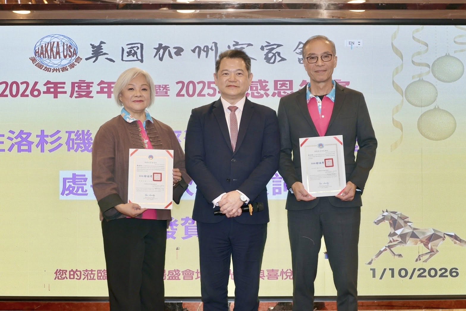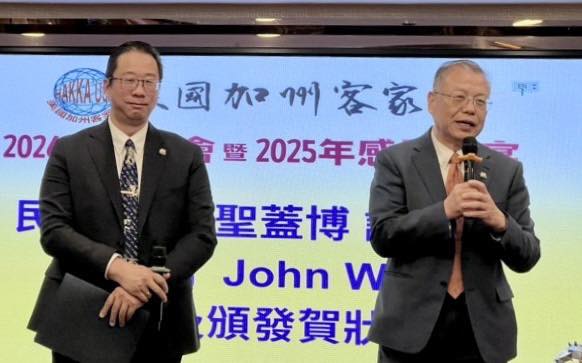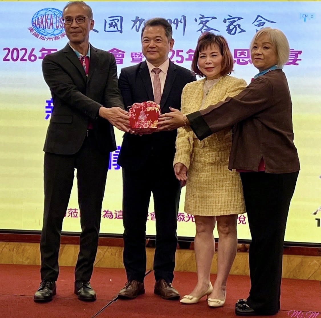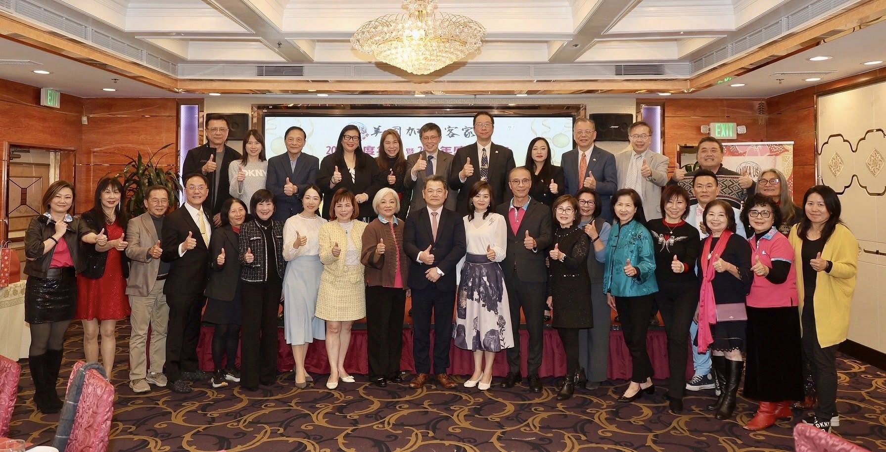 美國加州客家會於1月10日舉行年會暨年度感恩餐會,眾多客家鄉親與貴賓齊聚一堂。紀欽耀處長與行政院政務顧問陳玲華見證滿任會長黃永鉅與新任會長羅蔭葉交接,象徵薪火相傳、持續前行!
