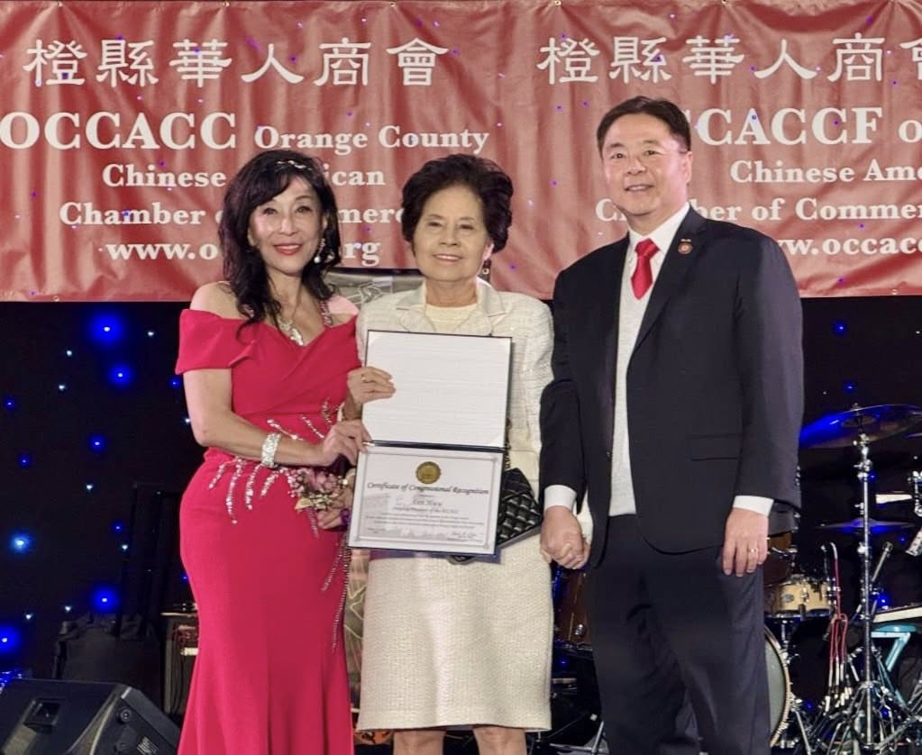 圖說3:聯邦眾議員劉雲平(右)偕母親劉丘繼聰(中)出席橙縣華人商會年會,並讚揚滿任會長胡安瀅(左)領導有方。