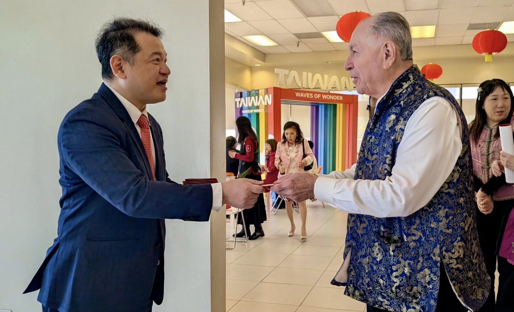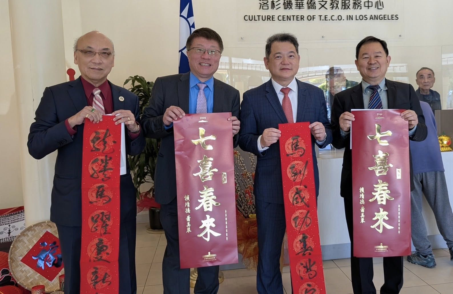 紀欽耀處長夫婦偕同仁於2月22日上午出席在洛僑中心舉行的新春聯合團拜,現場發送總統府馬年福袋及「七喜春來」春聯,祝福僑民們龍馬精神、萬事如意!當天包含聯邦眾議員趙美心(Judy Chu)、加州州眾議員方樹強(Mike Fong)、總統府國策顧問林榮松、行政院政務顧問陳玲華、吳兆峯及羅省中華會館聶澤英主席等眾多貴賓、社區領袖及僑胞踴躍參與,共賀新歲!