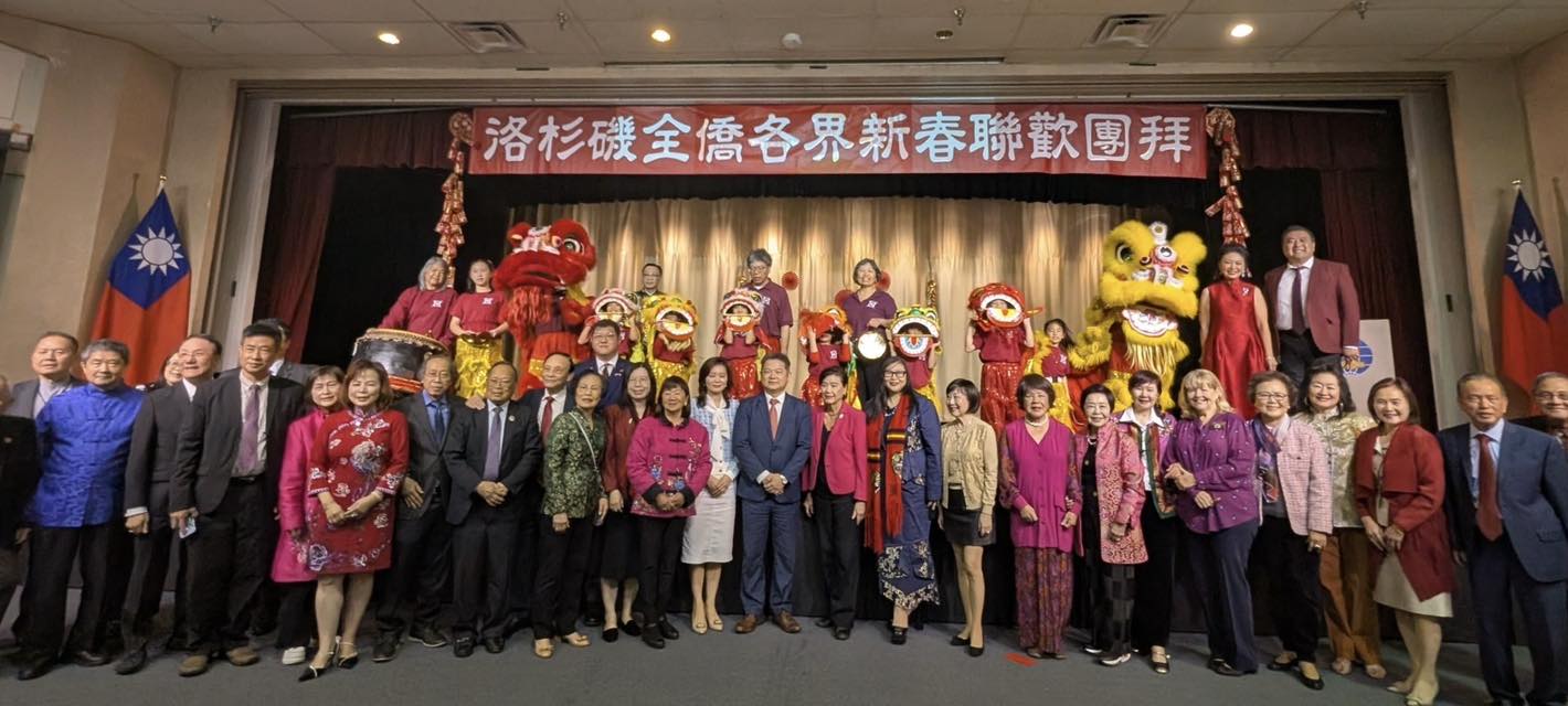 紀處長致詞表示,洛杉磯僑界長年支持中華民國、推廣台灣文化,在台美交流中扮演重要橋梁角色,感謝僑界持續推展國民外交,在海外成為支持政府的後盾! 團拜活動由喜瑞都中文學校學生舞獅揭開序幕,現場備有台灣特色小吃,還有美國中華藝術學會藝術家揮毫贈送春聯與水墨畫,傳遞家鄉年味。賴清德總統及僑務委員會也錄製賀歲影片,向海外僑民拜年!