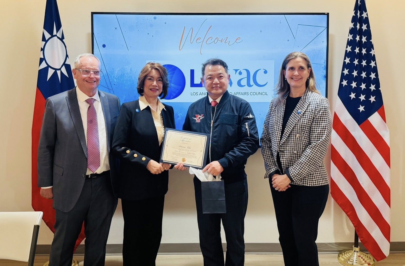 圖說1:洛杉磯世界事務協會(LACWA)董事會主席 Maria Contreras-Sweet (左2)頒發感謝狀予紀欽耀處長(右2)。