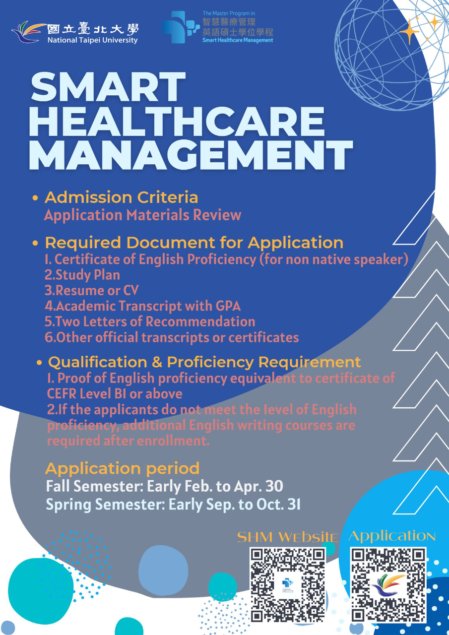 The Master Program in Smart Healthcare Management (SHM) is one of the international programs of NTPU. All courses are taught in English, emphasizing interdisciplinary studies combined with the fields of management, technology and healthcare. The program's ultimate goal is to enhance the quality ofmedical service for the betterment of humanity.