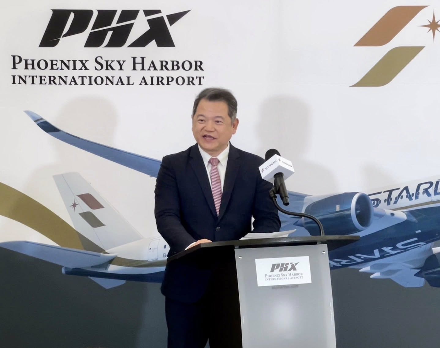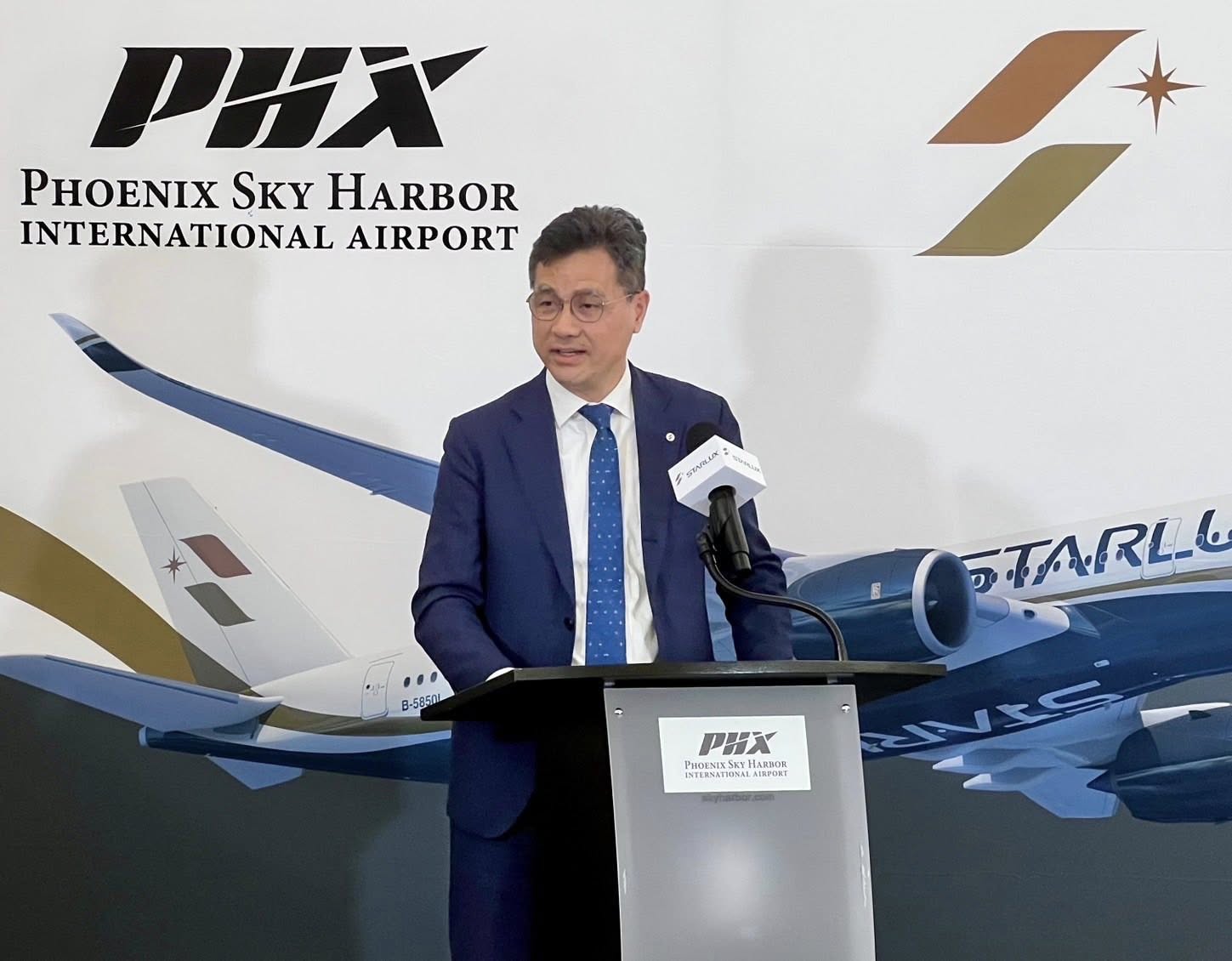 Director General Amino Chi was delighted to join Phoenix Mayor Kate Gallego and STARLUX Airlines CEO Glenn Chai in celebrating Starlux Airlines’ Taipei–Phoenix inaugural flight ceremony at Phoenix Sky Harbor International Airport on January 15, 2026.