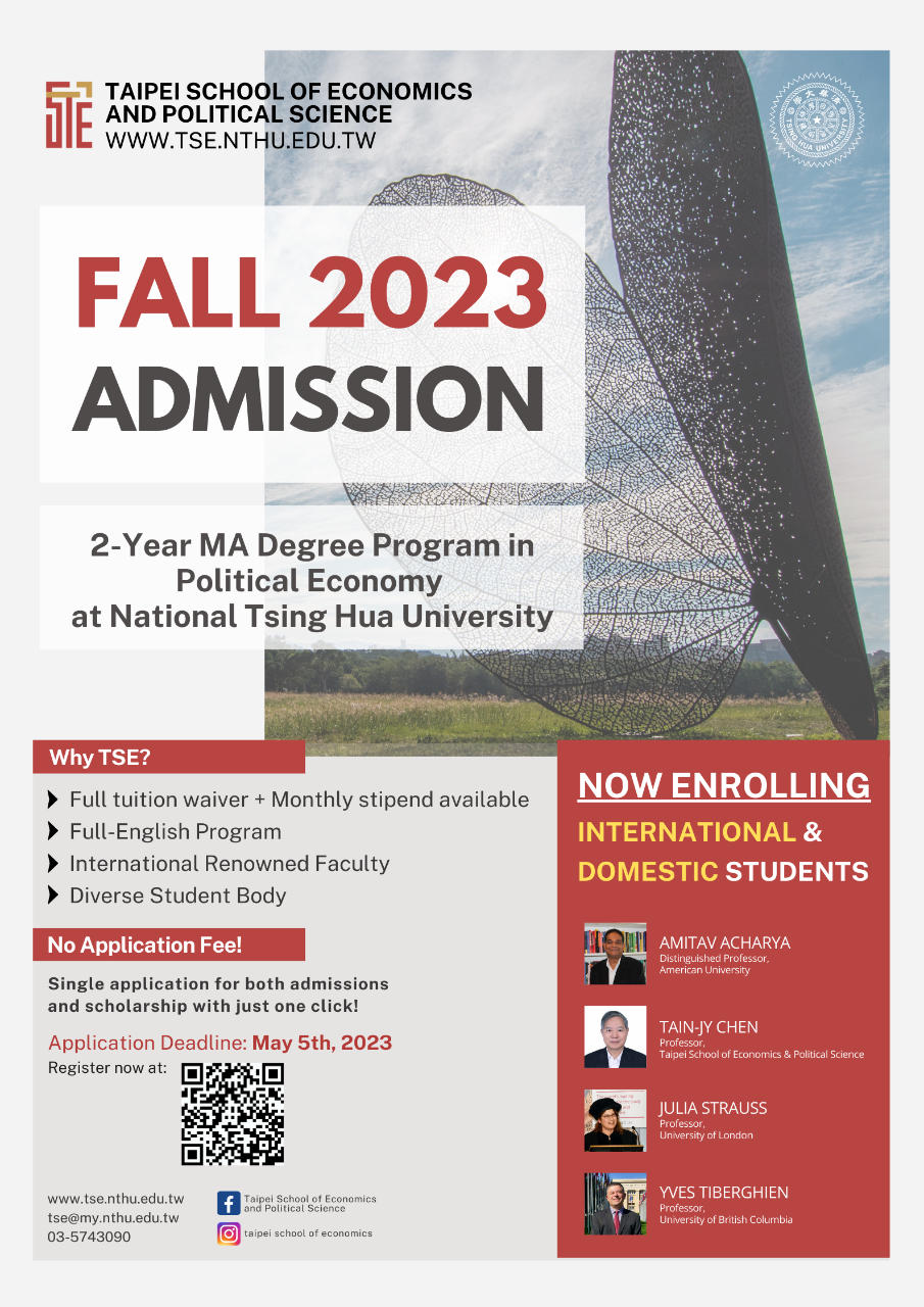 TSE Applications for Fall 2023 admission are now open until May 5, 2023. Full tuition waiver and monthly stipend are available. For more information, please visit https://www.tse.nthu.edu.tw/page/masters-programs