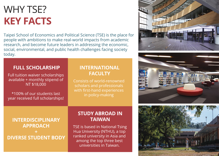 The Taipei School of Economics and Political Science (TSE) at NTHU mainly recruits international students and provides an English program with internationally renowned faculty. Its 2-year MA Degree Program in Political Economy specializes in gaining extensive knowledge of the dynamics of the Asian economies, the key trends underlying the global political economy and its transformation, and trains students to apply interdisciplinary knowledge to do holistic analysis.