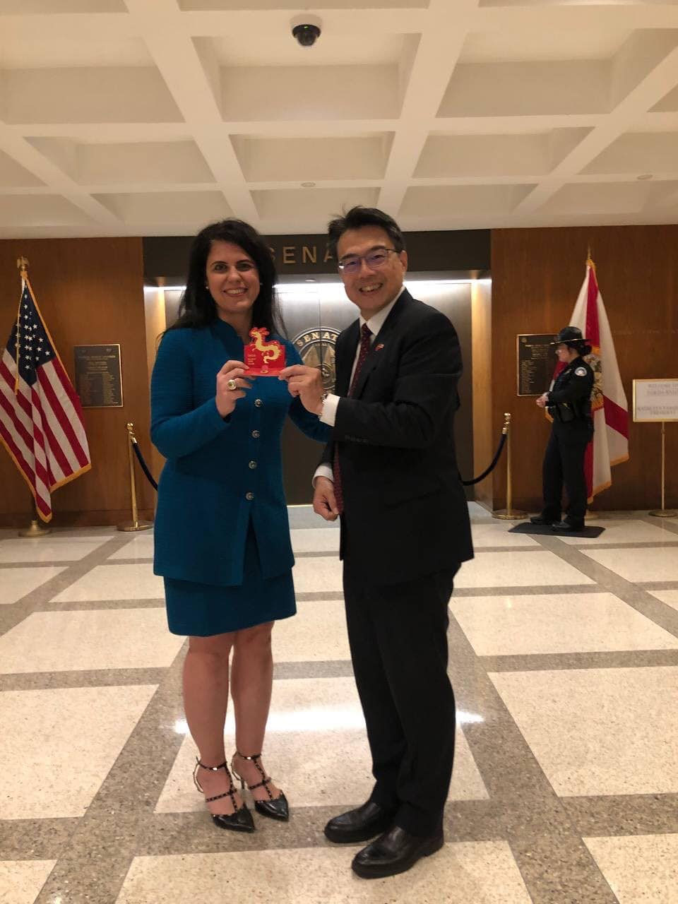 周處長在佛州參議會議事廳大門前與州參議員Ana Maria Rodriguez合影。
