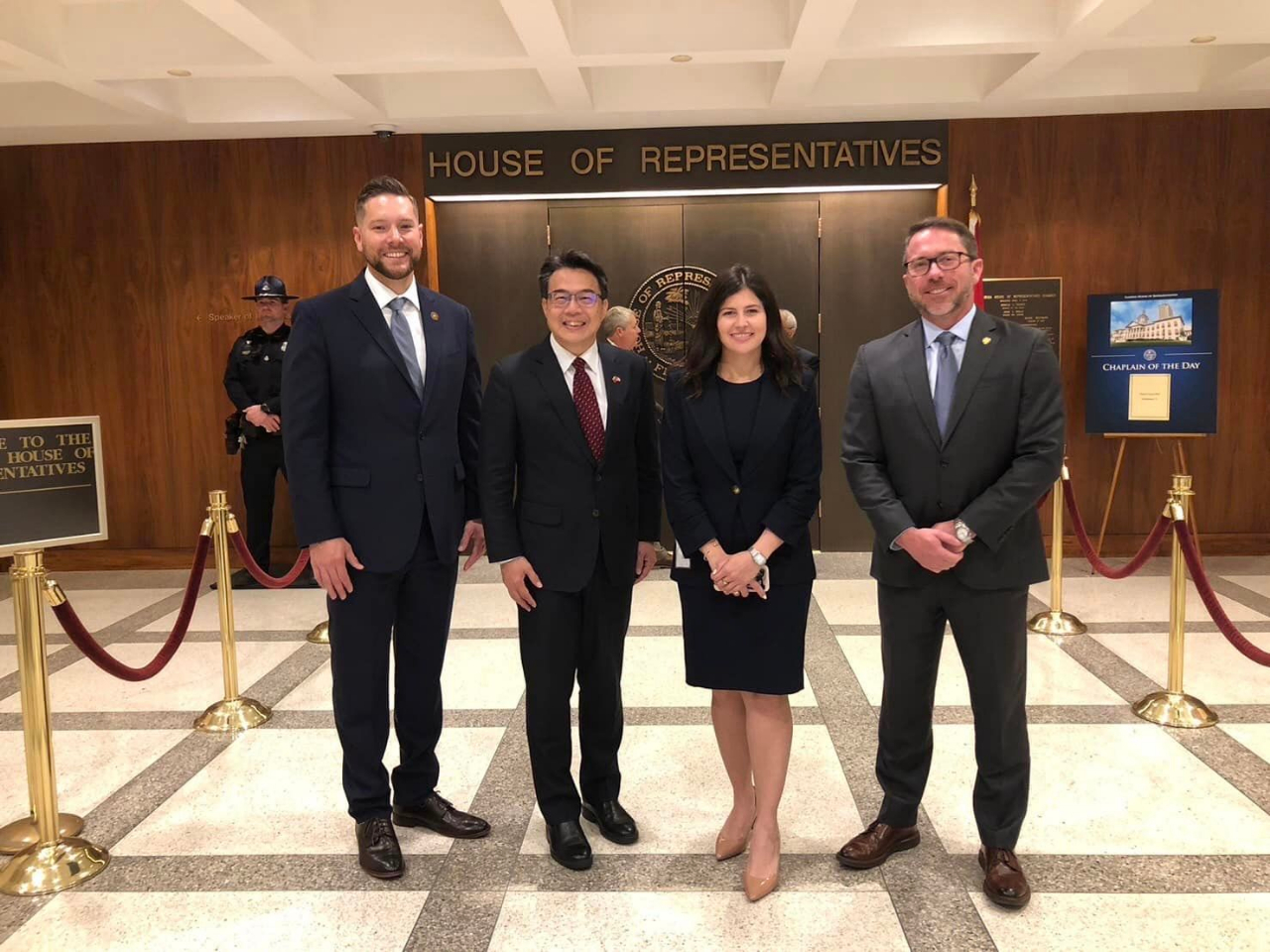 周處長在佛州眾議會議事廳大門前與州眾議員John Snyder (左一)、Demi Busatta Cabrera (右二)及 Jason Shoaf (右一)合影。