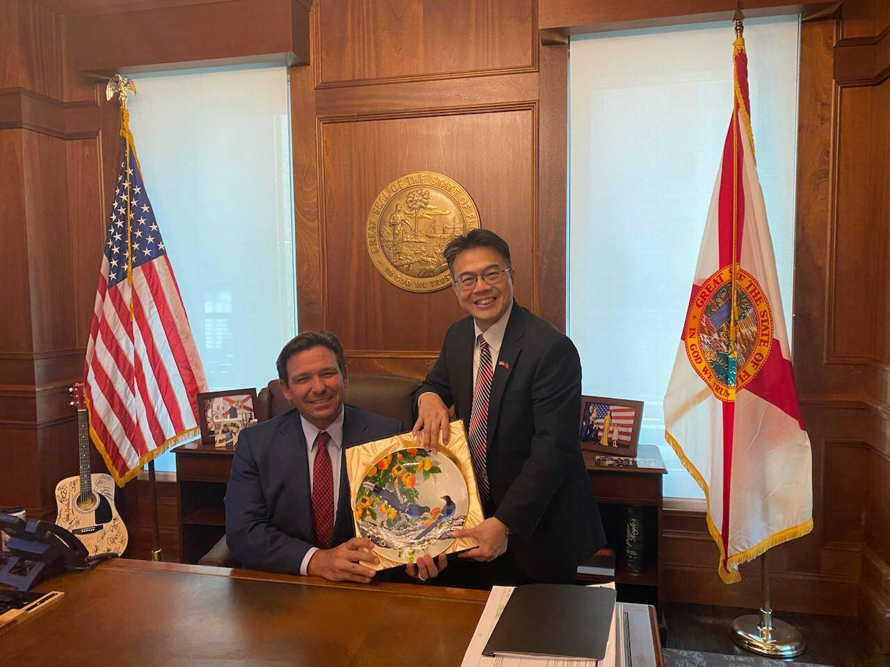 本處周處長4/16偕游組長嘉翔赴佛州首府Tallahassee 拜會Ron DeSantis 州長。D州長向來重視行政績效,關切自本年1月簽署「台佛經貿合作備忘錄」後,雙方於經貿、科技、高等教育及智慧農業等相關領域的交流進展。