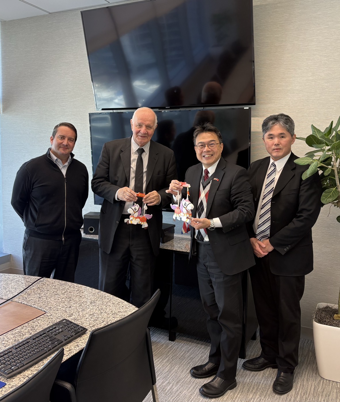 本處周處長偕游嘉翔組長向「邁阿密領事團」秘書長 Nabil Achkar 致上最誠摯的馬年祝福。 「邁阿密領事團」在 Achkar 秘書長40年來的積極推動下,已成為全美最活躍的領事團之一。