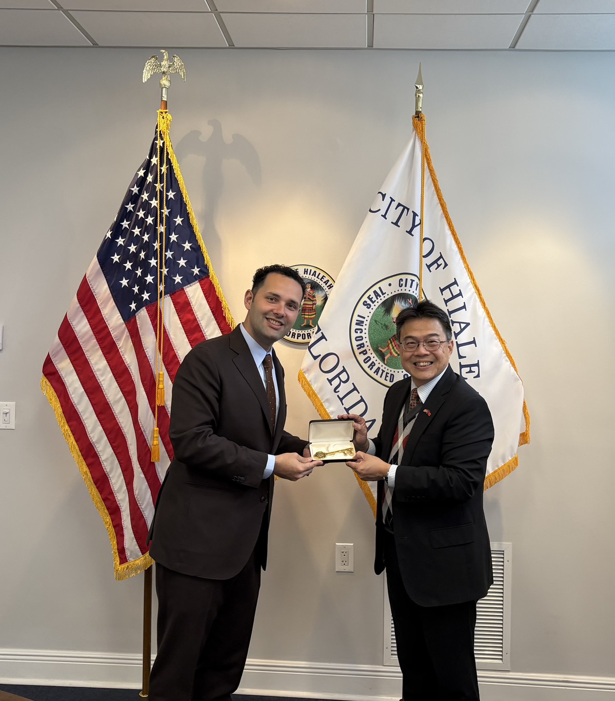 周處長偕游嘉翔組長2月2日前往南佛州海厄利亞市(City of Hialeah),拜會甫宣誓就職的新任市長Bryan Calvo。雙方就台佛經濟合作及海厄利亞市產業發展規劃等議題交換意見。 Calvo市長現年僅28歲,是海厄利亞市建市百年以來最年輕的市長,在此之前曾擔任該市市議員。
