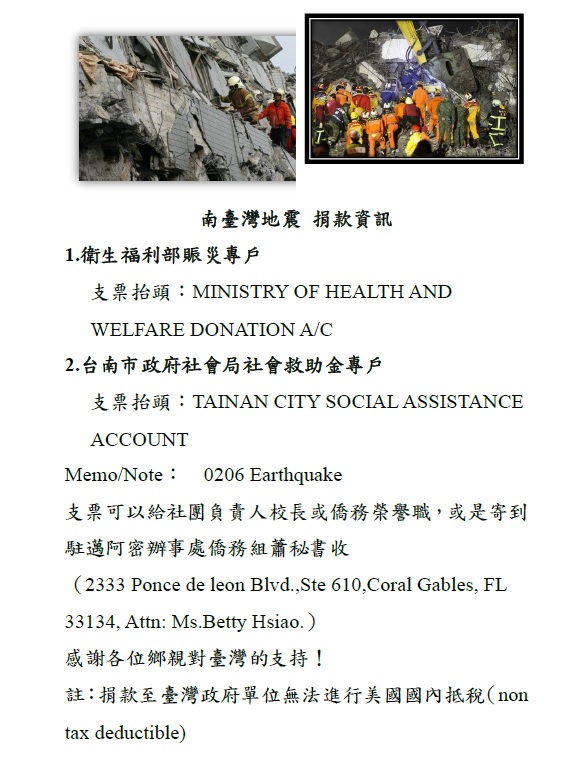 有關海外僑胞響應南臺灣「0206地震」捐款相關資訊