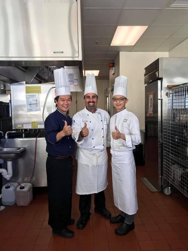 b 溫國智主廚與助手陳瑞昌老師與邁阿密廚藝學校(Miami Culinary Institute)廚藝教授Jose E. Casals合影