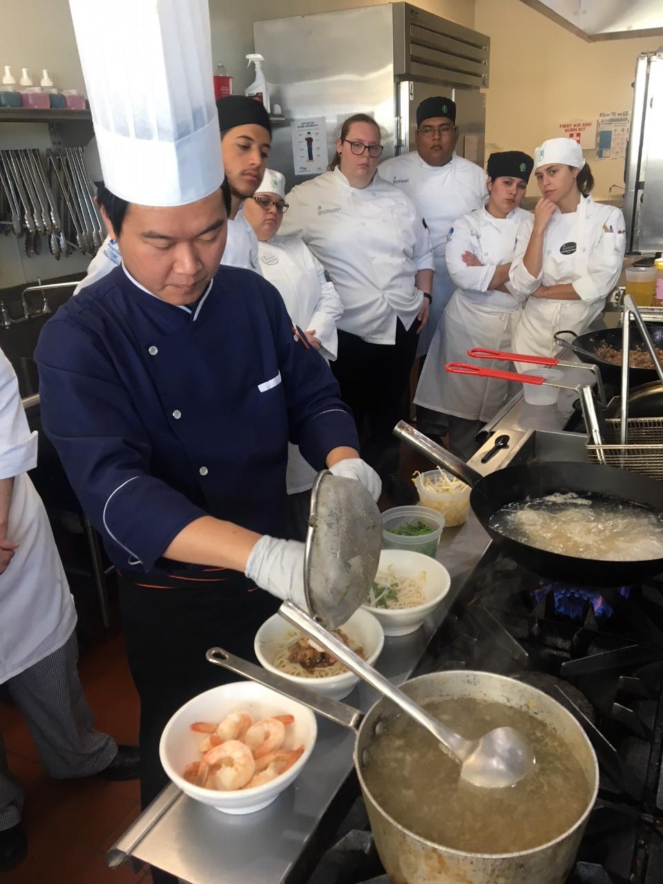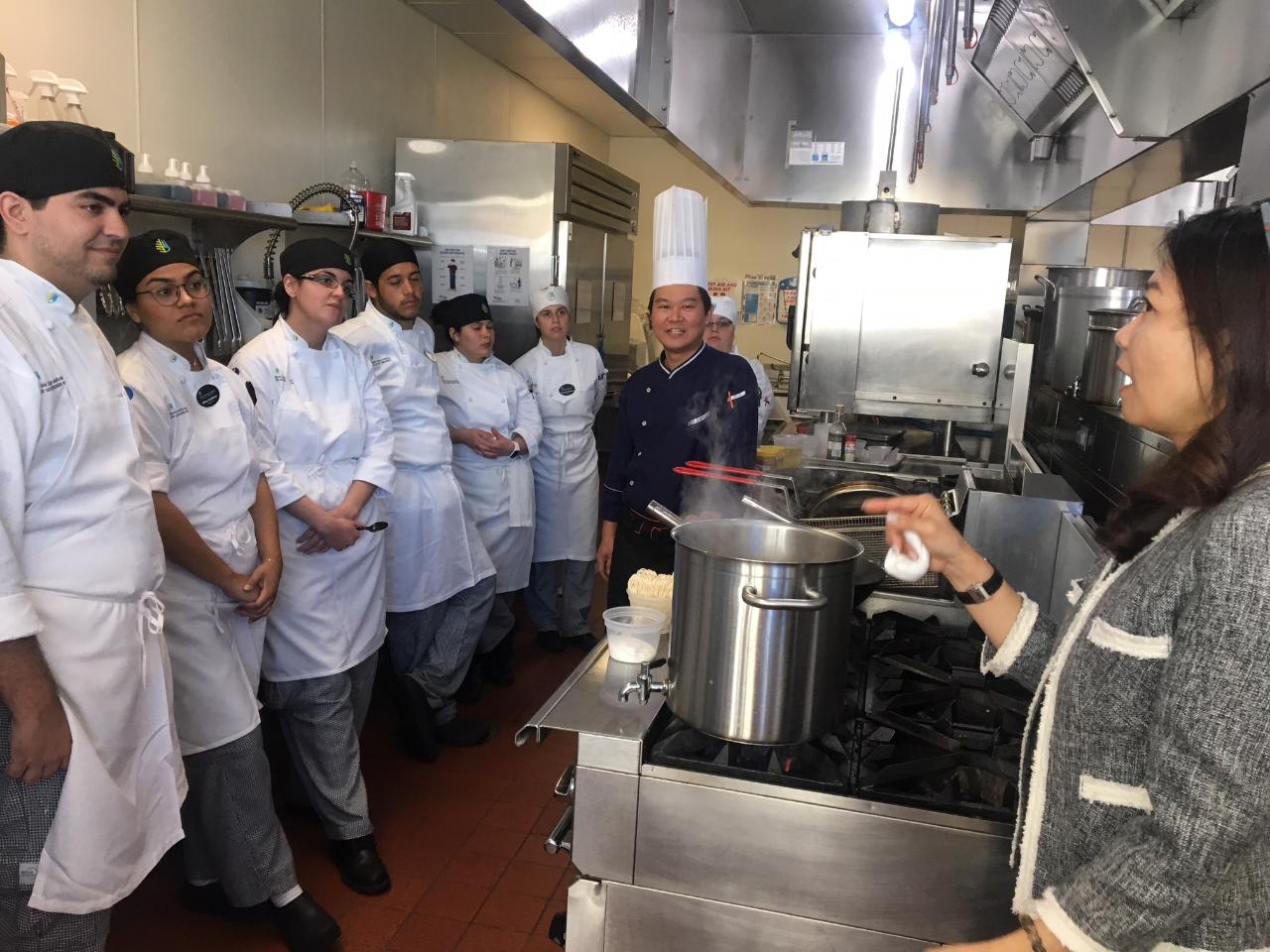 溫主廚向邁阿密廚藝學校廚藝系學生親自示範台式魯肉飯、擔仔麵、乾燒蝦、鹹酥雞及蜂巢蝦,從切肉刀法、調味順序、製作高湯等一步一步帶領學生瞭解台式料理,溫主廚堅持用傳統的台菜調味方式及手法來呈現食材的最佳風味,示範完後由該校師生進行品嚐,課後學生踴躍向前與溫主廚請益,溫老師也鼓勵學生多接觸不同文化特色料理,透過交流來精進廚藝。