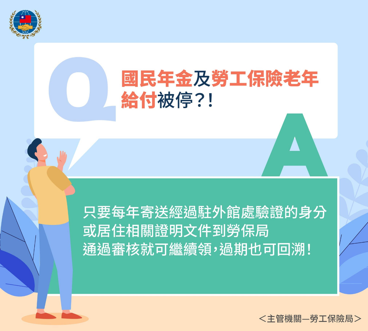 依國民年金法及勞工保險條例相關規定,倘戶籍遷出後,仍可每年檢送經居住國(地)的臺灣駐外館處驗證之居住證明文件,由勞工保險局審核通過後,即可續領,居住證明文件辦理方式及相關表件請點下方連結: https://www.roc-taiwan.org/usmia/post/5610.html