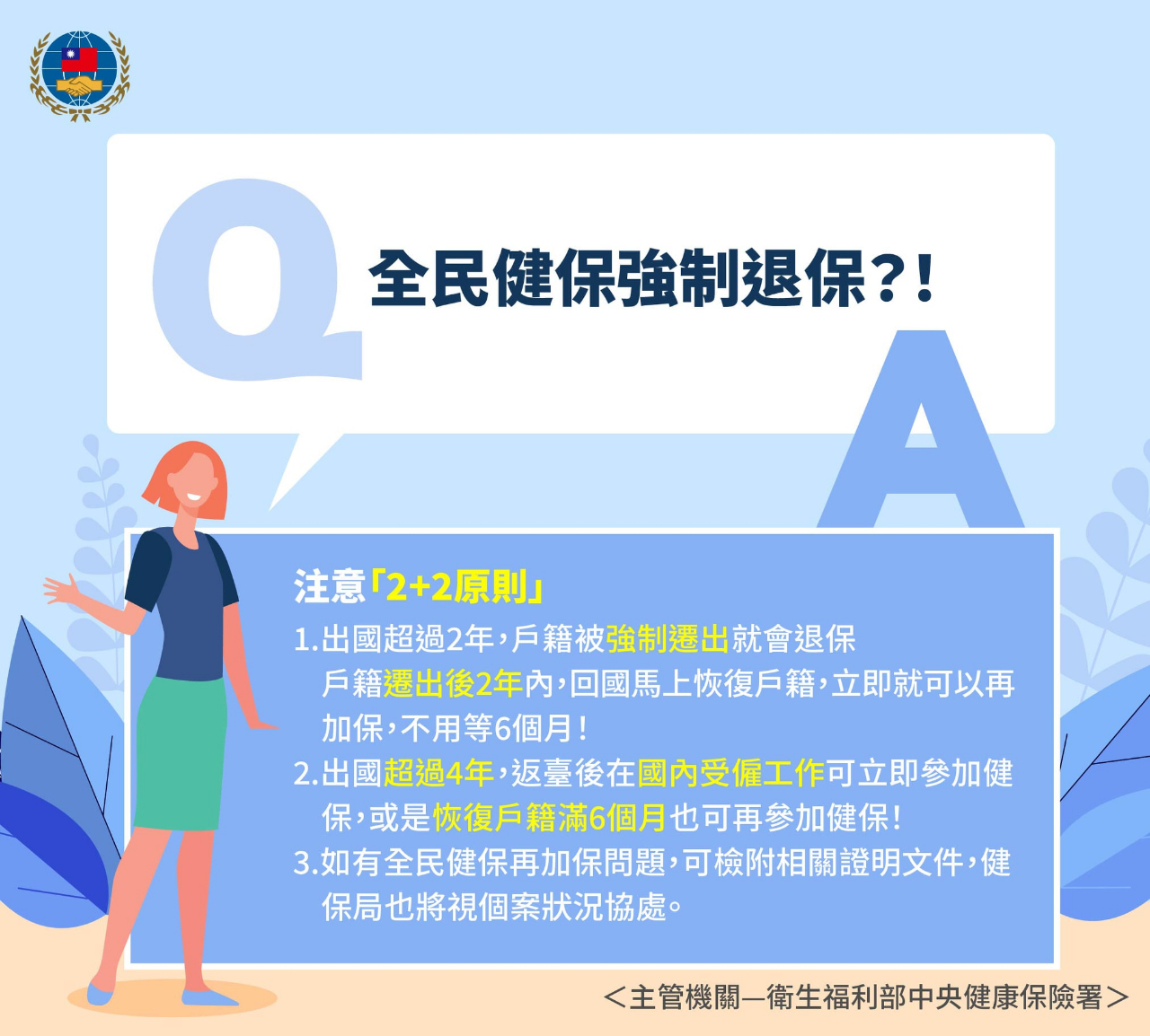 現行全民健康保險法規定,戶籍遭強制遷出後須退保,因退保後即無須繳納健保費,對民眾權益並無影響。而戶籍遷出後只要在2年內返國恢復戶籍,即可以再次參加健保、繳納保費並使用健保資源,無6個月等待期的問題。