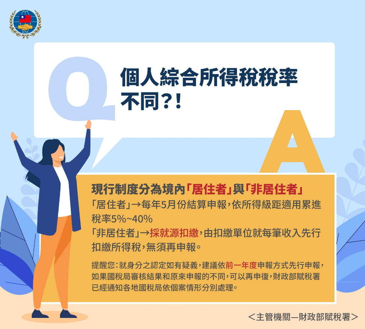 現行制度分為境內「居住者」與「非居住者」,「居住者」每年5月份結算申報,依所得級距分別適用累進稅率自5%至40%;「非居住者」採就源扣繳,由扣繳單位就每筆收入先行扣繳所得稅,無須再申報。如有疑義,建議依前一年度申報方式先行申報,如國稅局審核結果和原申報不同,可再申復。